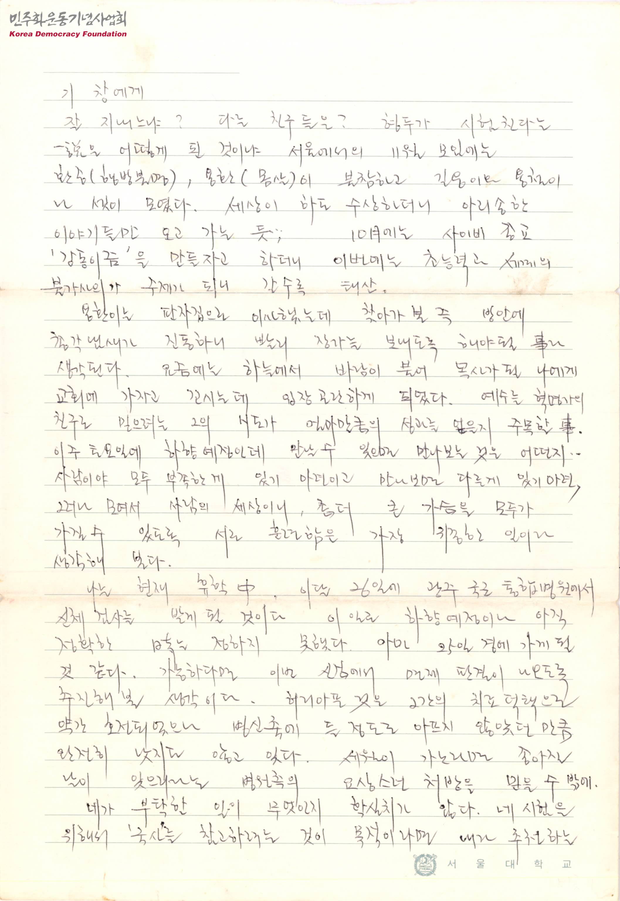 - 오랜만의 친구에게 안부를 묻는 내용, 국사 관련 서적을 추천하는 내용, 진실을 추구하는 길은 많은 고통이 있다는 넋두리 등이 적힌 편지