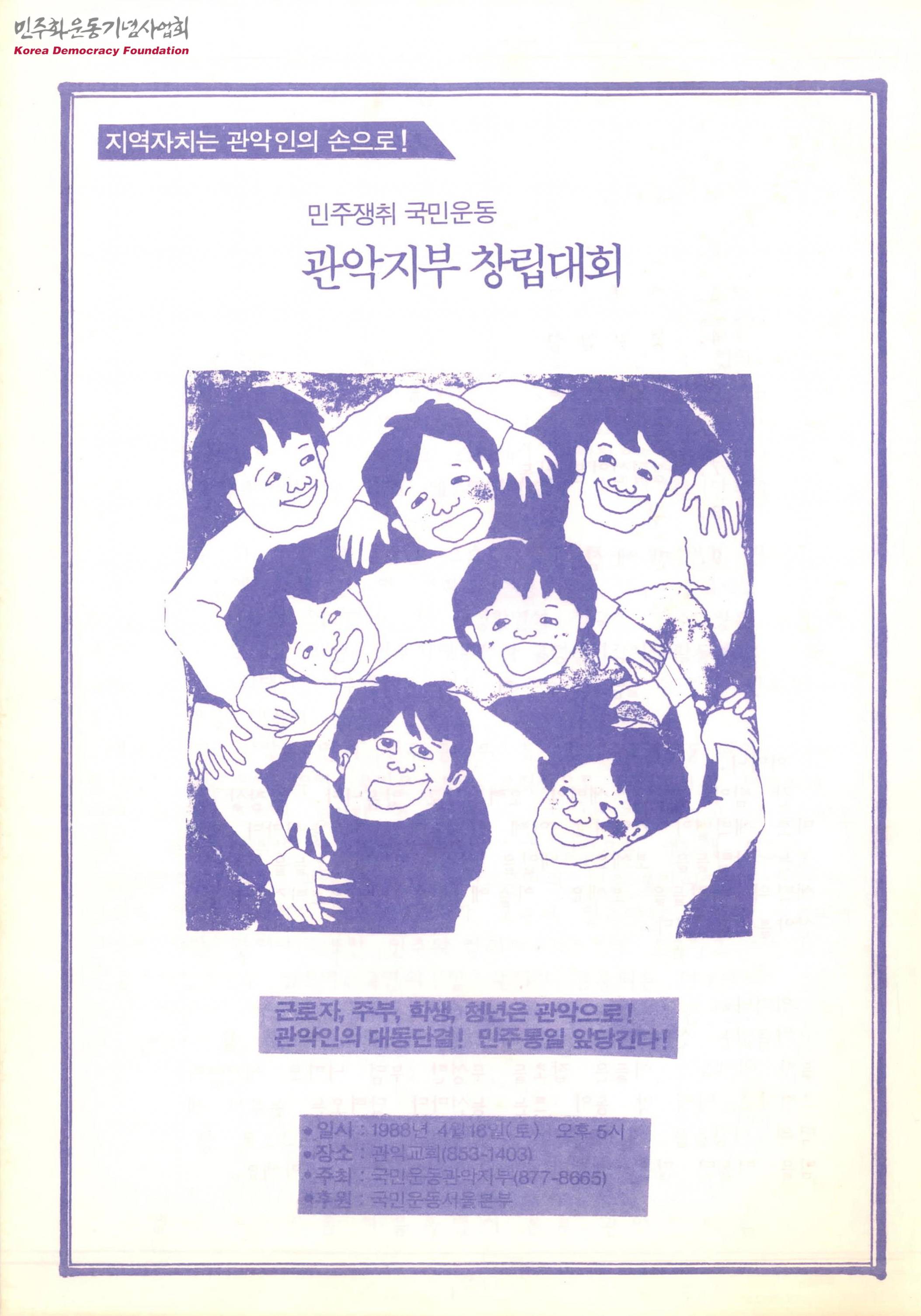 - 관악구 주민의 민주·통일의지를 바탕으로 조국의 민주화와 통일을 이루는데 이바지하기 위해 창립된 단체의 창립대회 자료집으로 수록된 내용은 다음과 같음 -순서 -창립선언문 -관악구지부 사업계획안 -경과보고 -민주쟁취 국민운동 서울특별시본부 관악구지부 정관