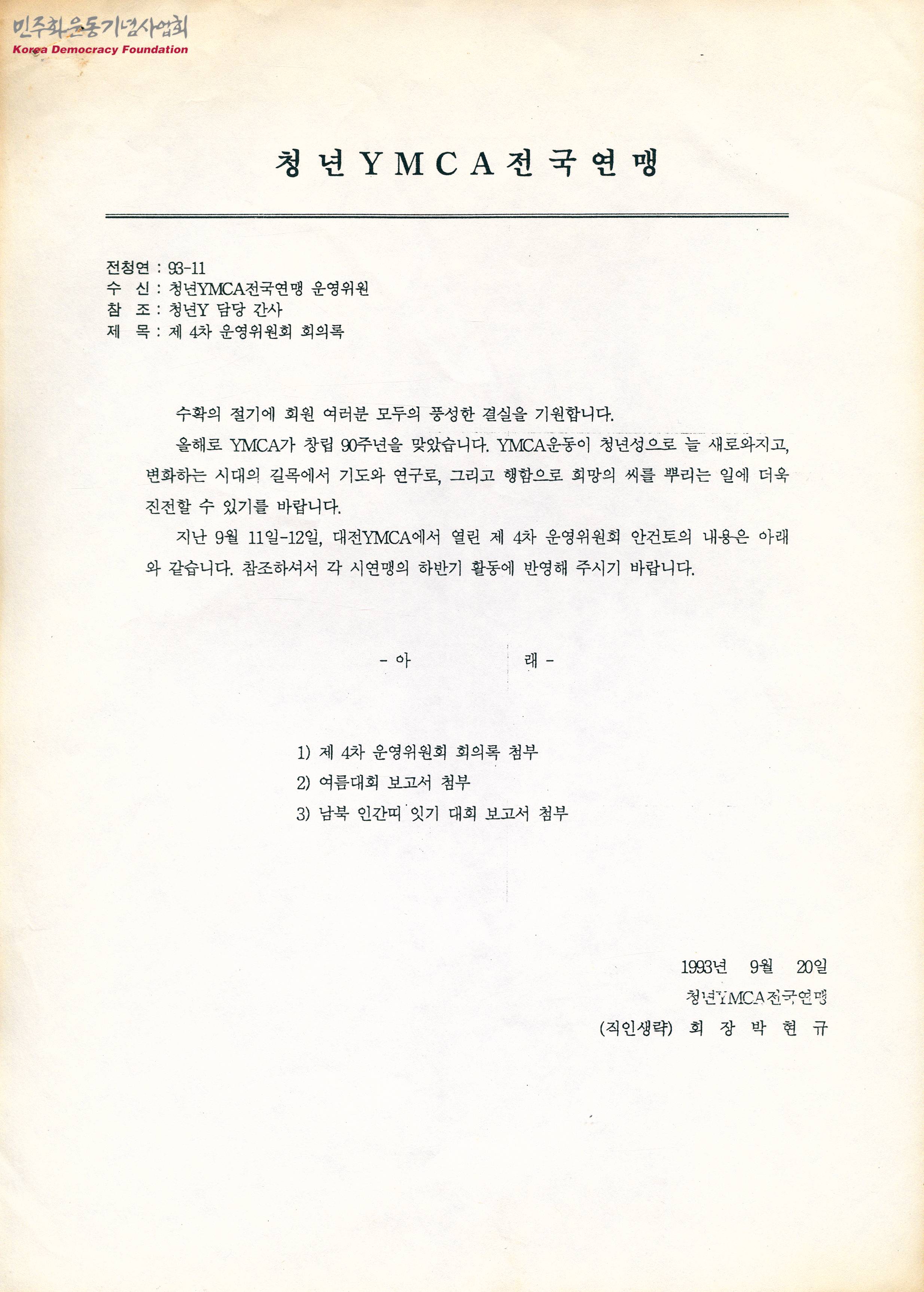 - 대전YMCA에서 개최된 제 4차 운영위원회 안건토의 내용에 대해 알리는 내용이 수록된 문서로, 제 4차 운영위원회 회의록, 여름대회 보고서, 남북 인간띠 잇기 대회 보고서가 별첨문서로 첨부되어 있음