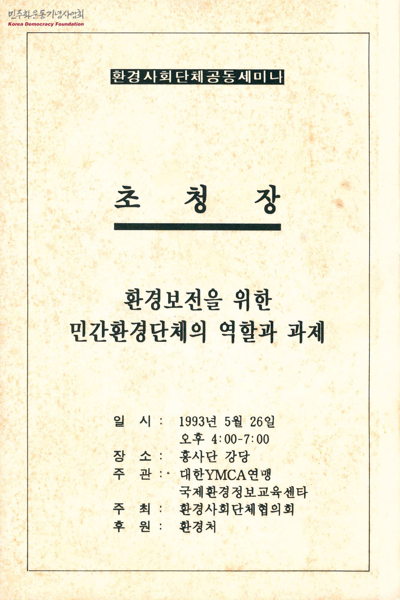 - 환경보전을 위한 민간환경단체의 역할과 과제 세미나의 주요 내용, 일정표 등의 내용이 수록된 초청장