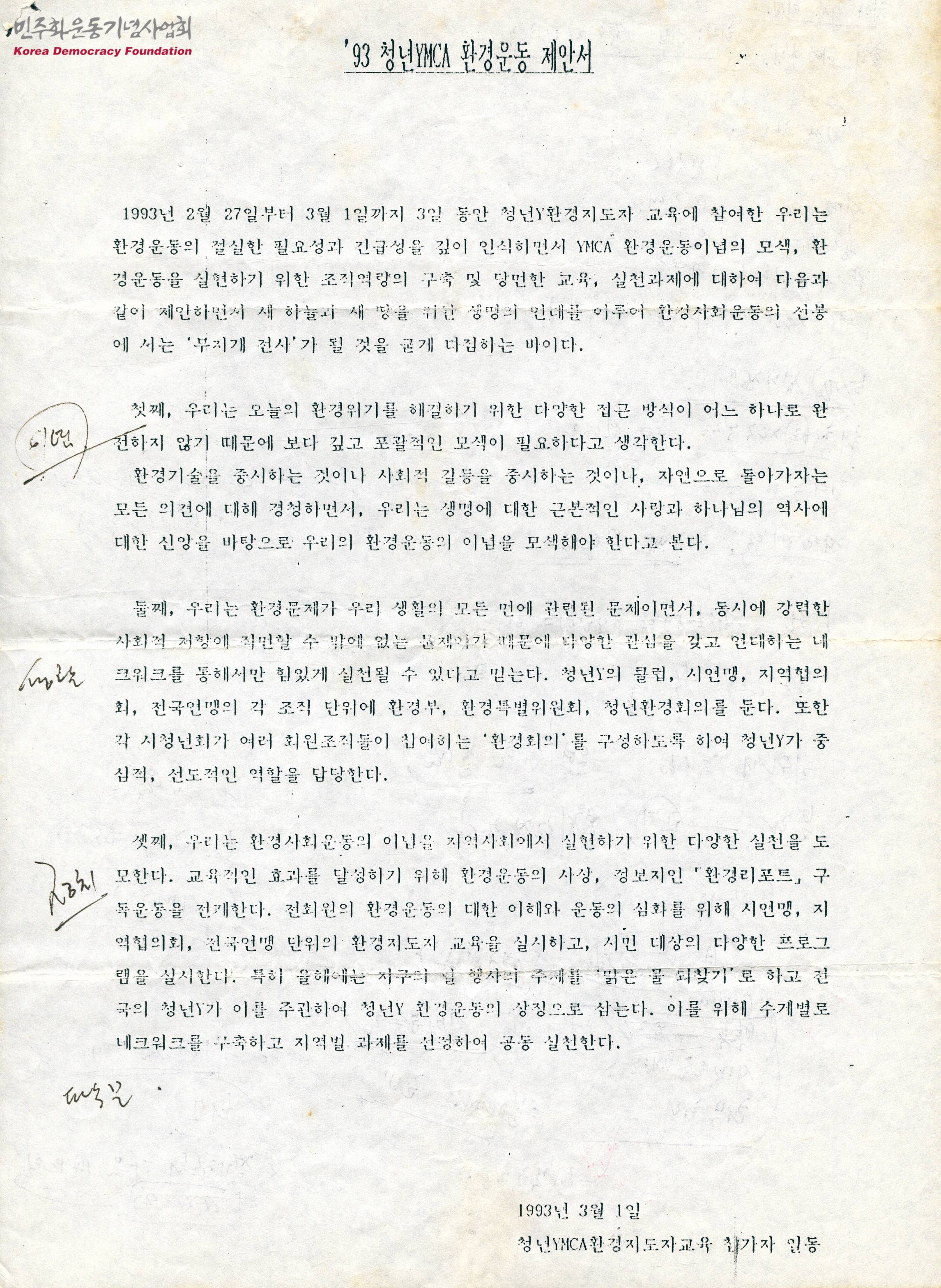 - YMCA 환경운동이념의 모색, 환경운동을 실현하기 위한 조직역량의 구축을 위해 제안하는 내용이 담긴 문서