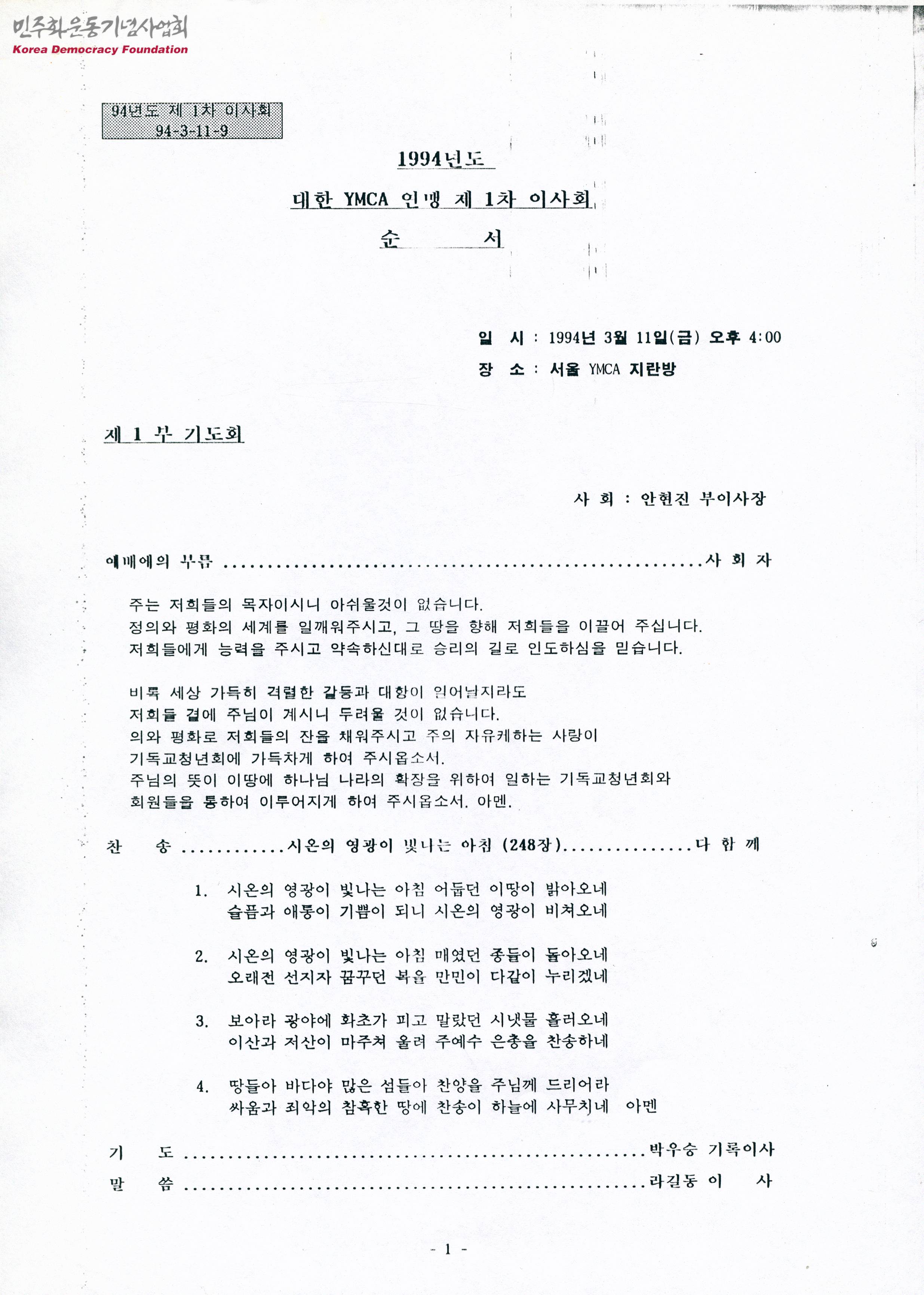 1994년도 대한 YMCA 연맹 제 1차 이사회 순서