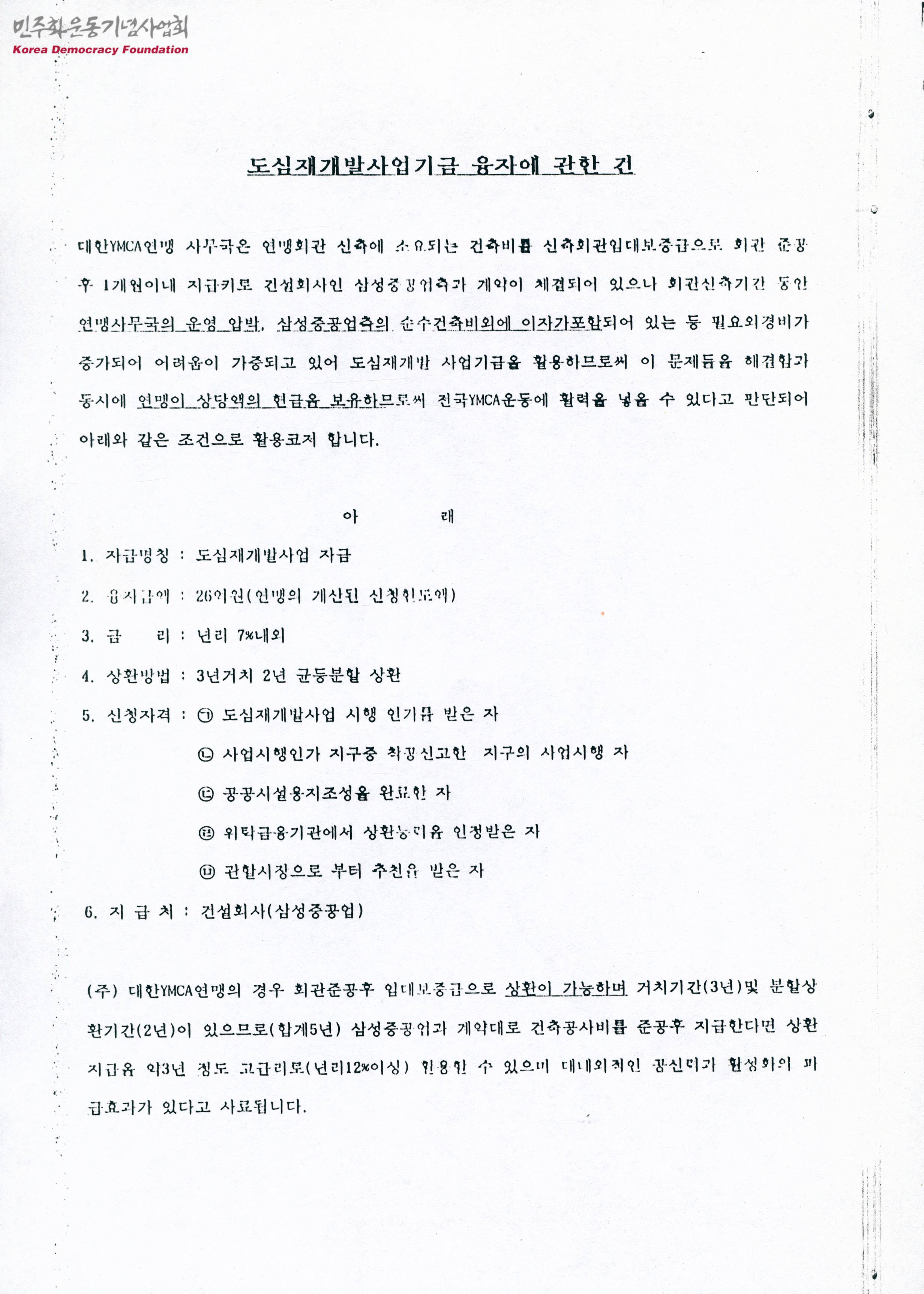 - 연맹회관 신축에 어려움이 있어 도심재개발 사업기금을 활용해 문제를 해결하겠다는 내용이 수록된 문서로 다음과 같은 내용이 수록되어 있음 1. 지급명칭 2. 융자금액 3. 금리 4. 상환방법 5. 신청자격 6. 지급처