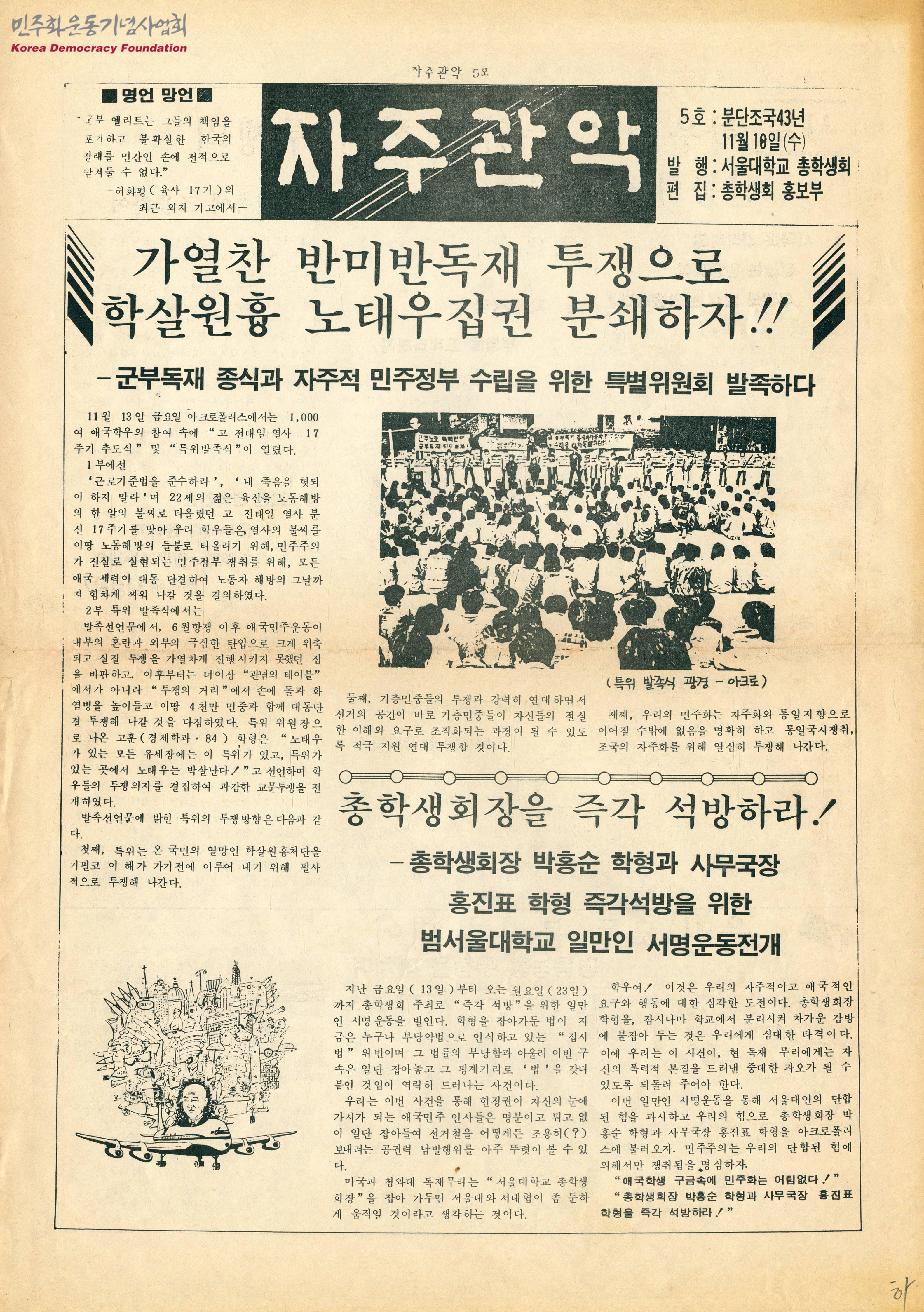 - 구속된 총학생회장 박홍순과 사무국장 홍진표의 석방을 요구하는 서명운동전개 소식과 미 국방성 더윈스키 차관의 방한을 비판하는 사설 등이 실린 정간물