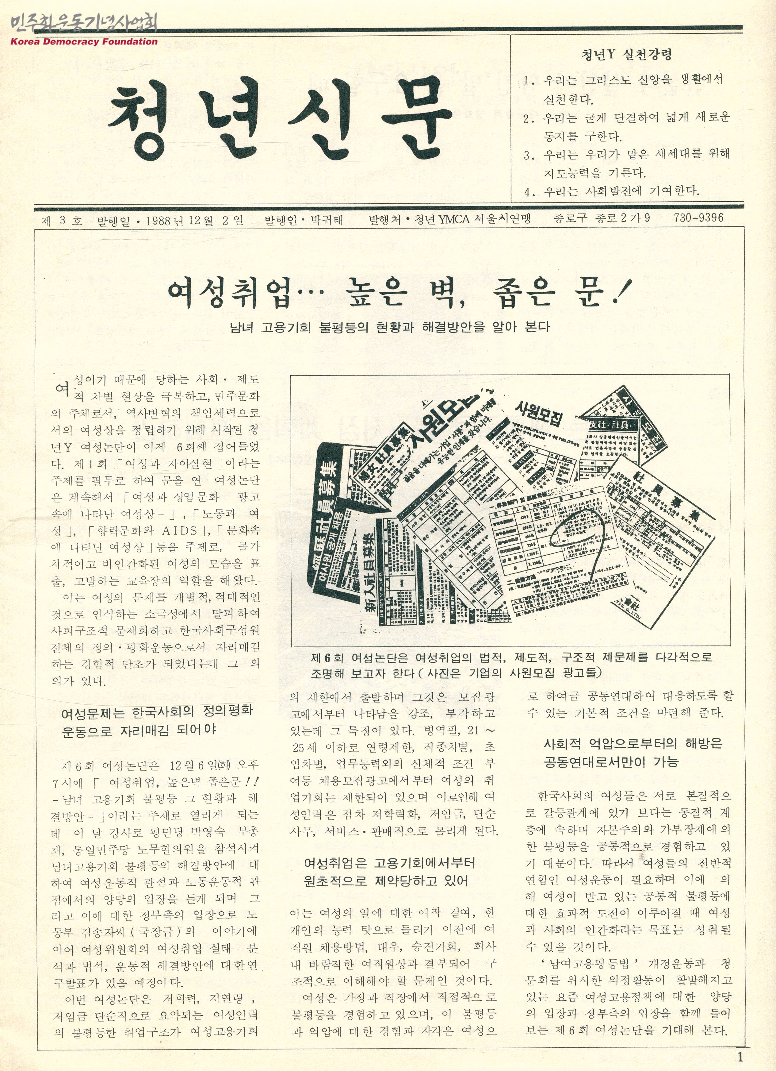- 여성고용기회의 제한이 여성취업 문제의 근본적인 원인임을 지적하며 이를 여성들의 공동연대를 통해 해결해야 한다는 내용의 글과 노태우 대통령의 담화를 비롯한 6공화국의 발표들이 국민들을 기만하는 말에 그친다는 것을 지적하며, 모든 사람들이 그들에게 진실한 말을 요구해야 한다는 사설 등이 실려있는 정간물