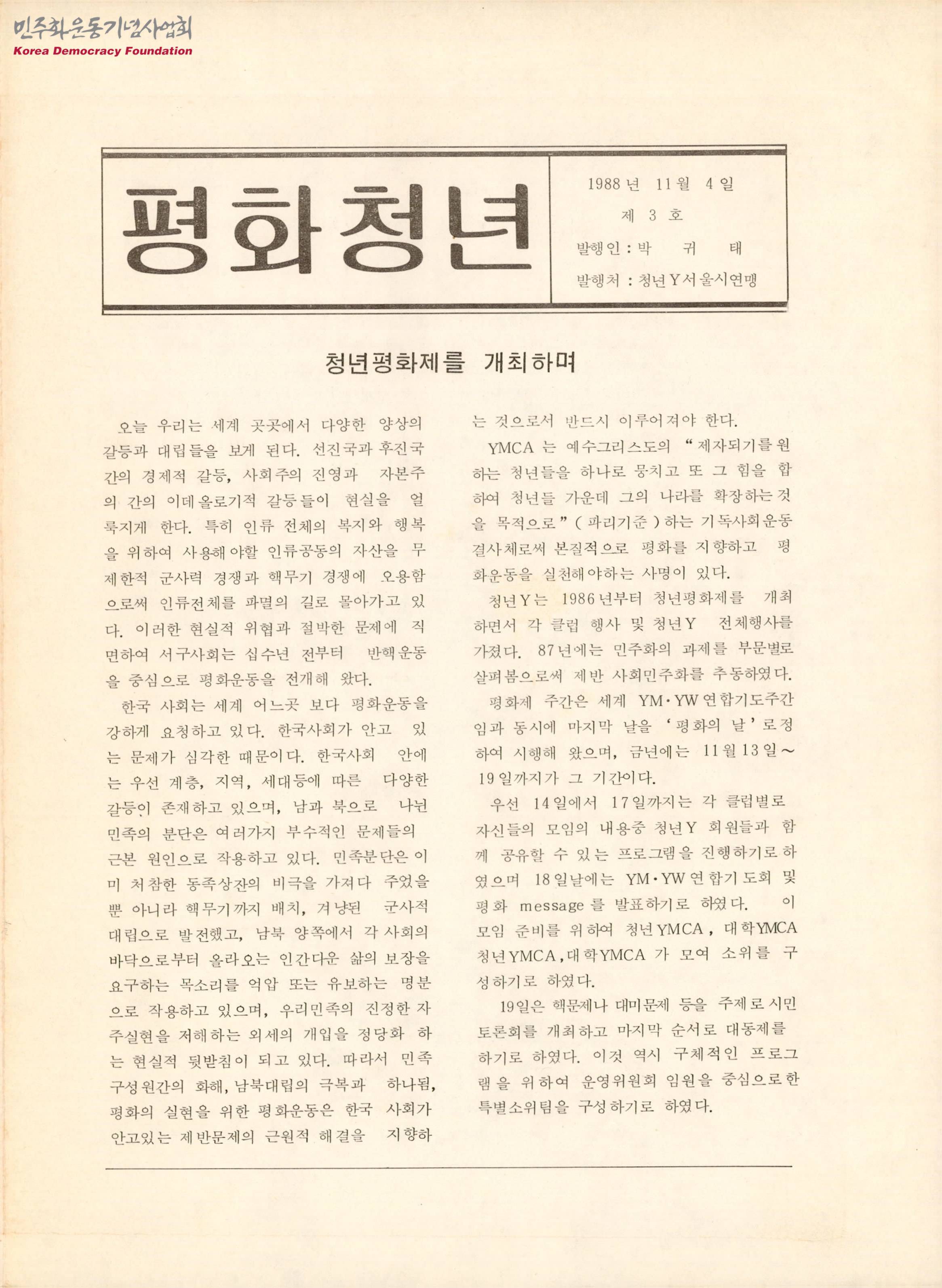 - 서초동 꽃마을에서 발생한 화재로 피해 주민들의 거주문제 해결을 위해 YMCA가 그들과 연대해야 한다는 내용의 글 등이 실려있는 정간물로 목차는 아래와 같음 -시평 -보고 -말씀 -탐방 -청년통신 -영화감상