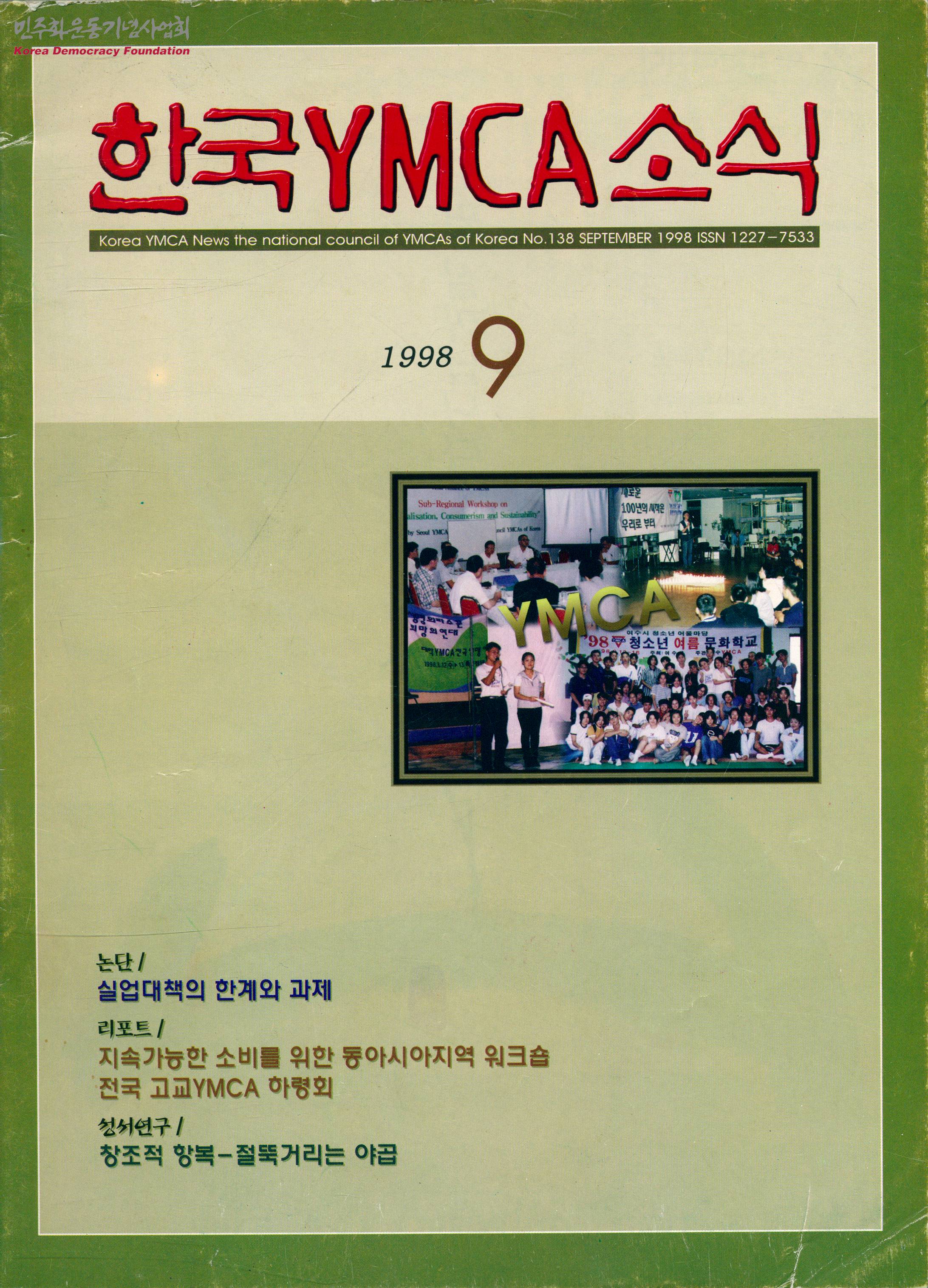- 지속가능한 소비를 주제로 진행된 동아시아 지역YMCA워크샵에 대한 보고서와 지방자치시대 시민운동의 방향을 다룬 글 등이 실려있는 정간물로 목차는 아래와 같음 -논단 -YMCA리포트 -성서연구 -기획연재: 지방자치 다시보기 -Y운동의 현장을 찾아서 -연맹소식·전국YMCA소식 -서평·회원마당 -공지사항