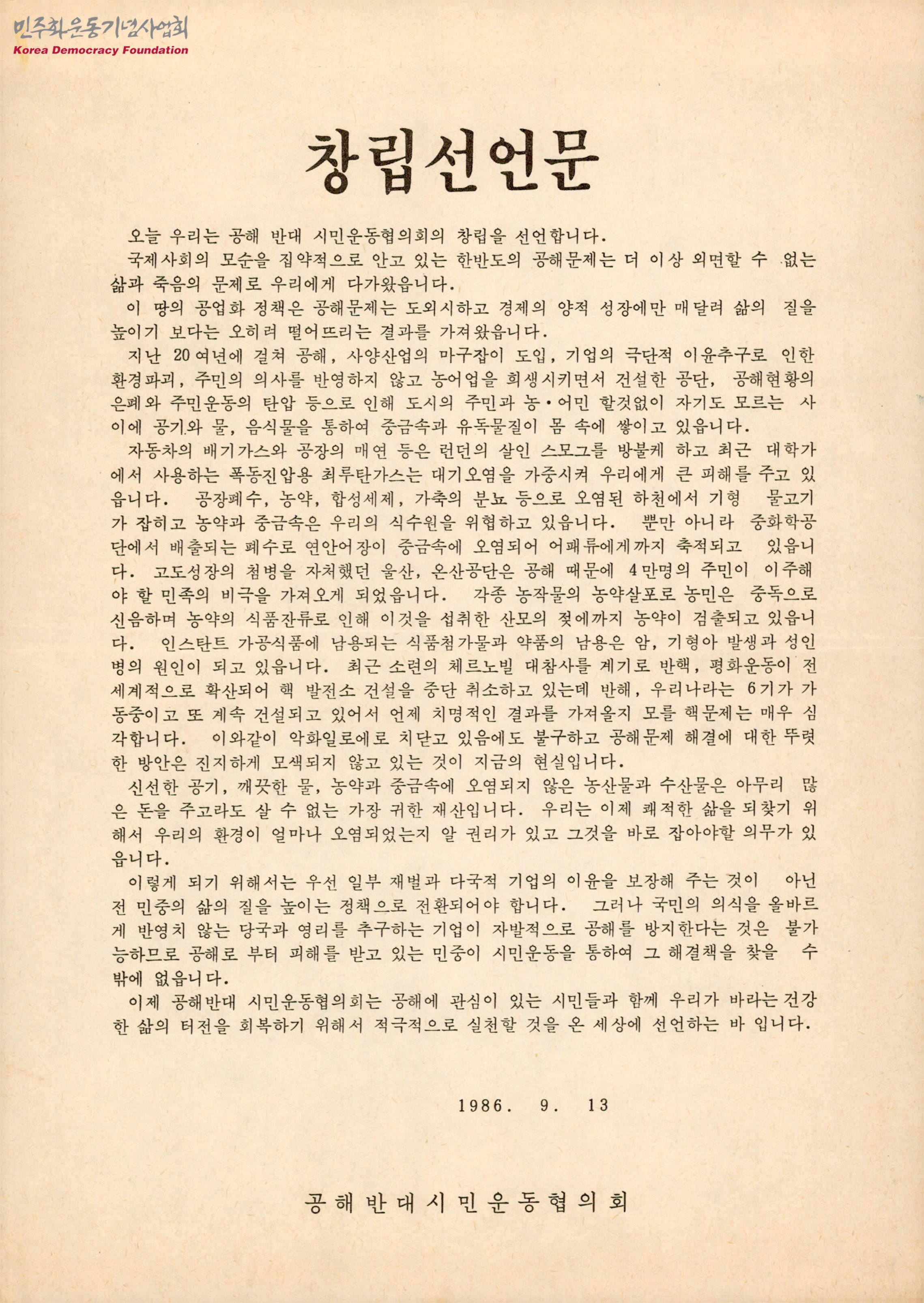 창립선언문[공해 반대 시민운동협의회]