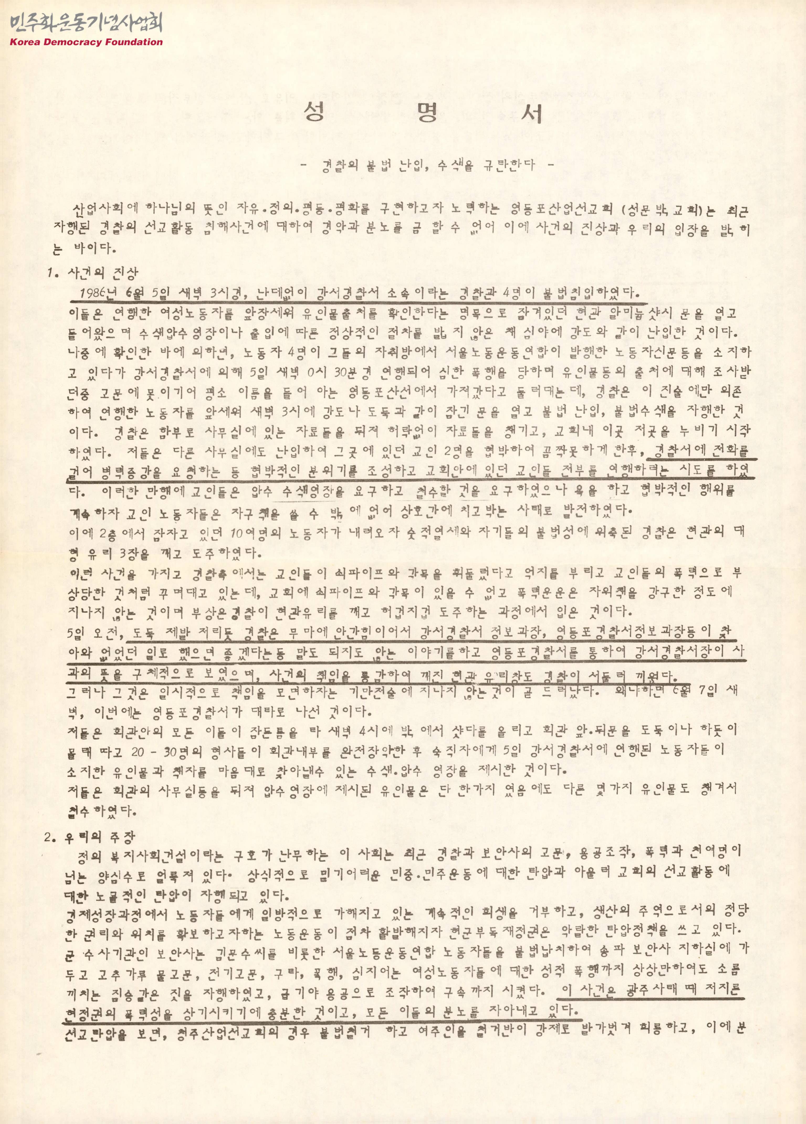 - 1986년 6월 5일 영등포산업선교회에 경찰이 불법침입과 수색을 자행한 사건의 진상과 이에 대한 주장이 담긴 문서