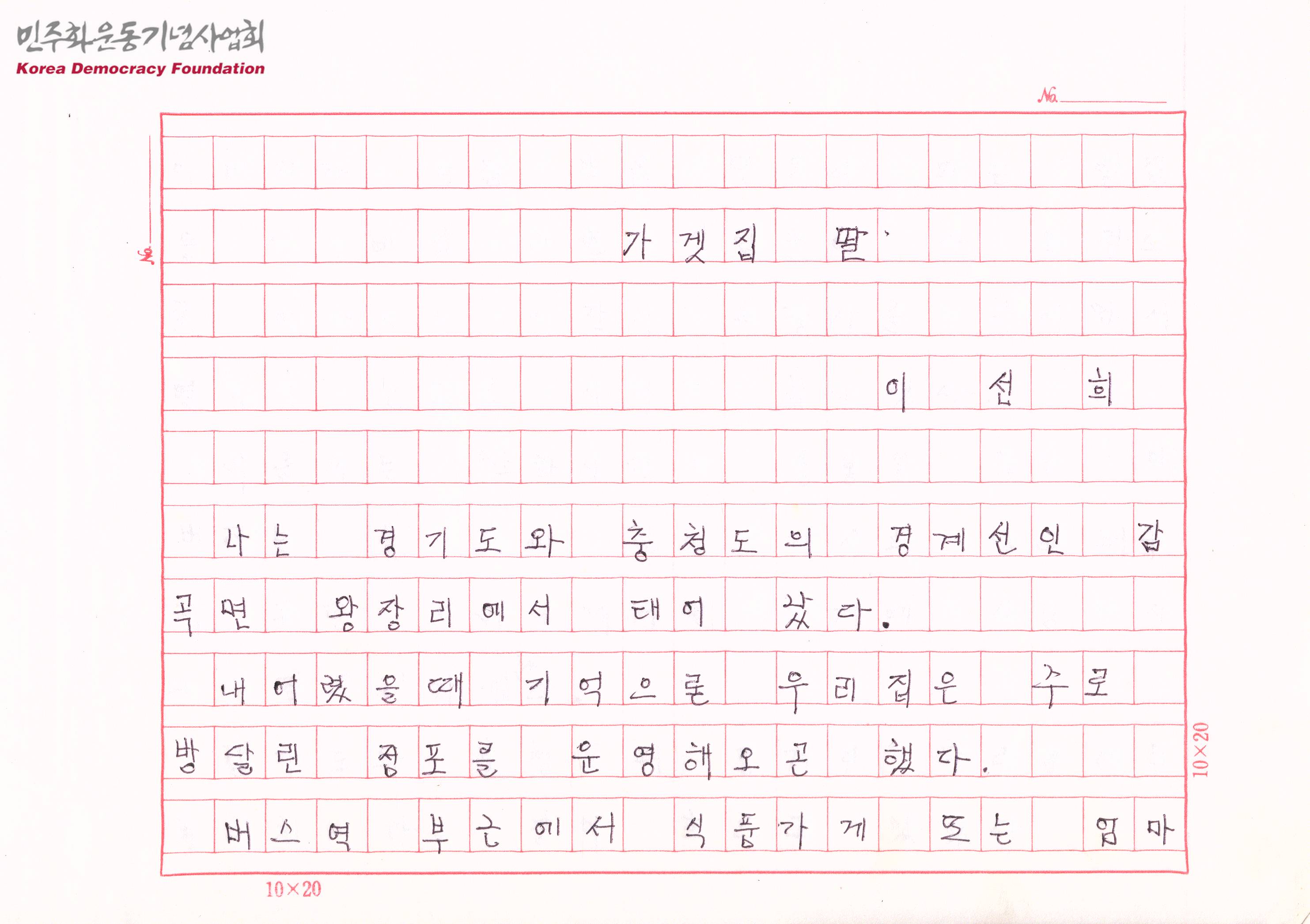 - 충청북도 음성군 감곡면 왕장리에서 태어난 이선희의 개인적인 어린시절 일화로 가게를 운영하시던 어머니와 그 속에서의 본인의 이야기로 진행되는 문서