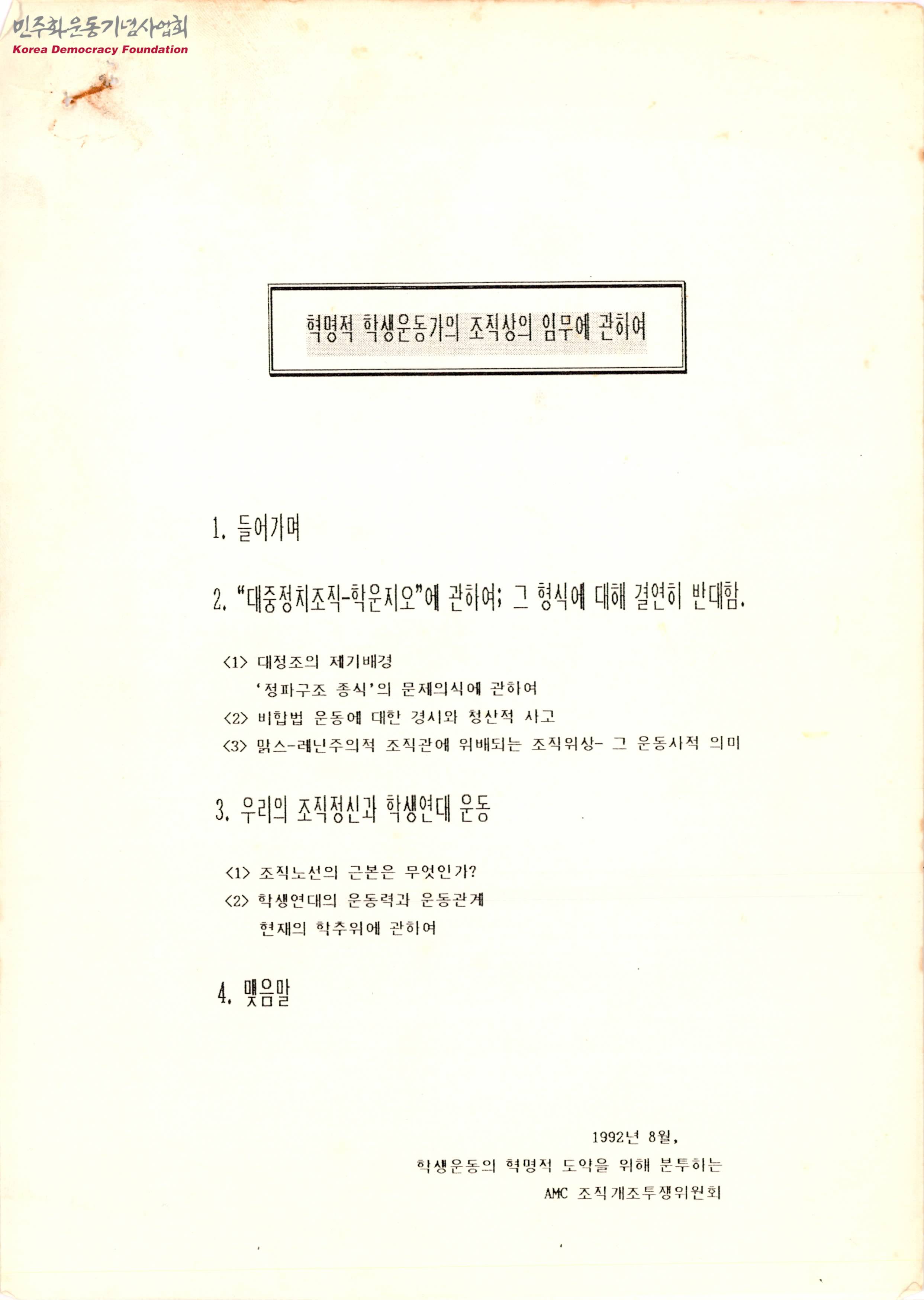 - 학생연대의 조직개혁투쟁의 진행, 학생연대로의 결집의 필요성 등의 내용이 수록된 문서로 목차는 다음과 같음 1. 들어가며 2. 대중정치조직-학운지오에 관하여; 그 형식에 대해 결연히 반대함 3. 우리의 조직정신과 학생연대 운동 4. 맺음말