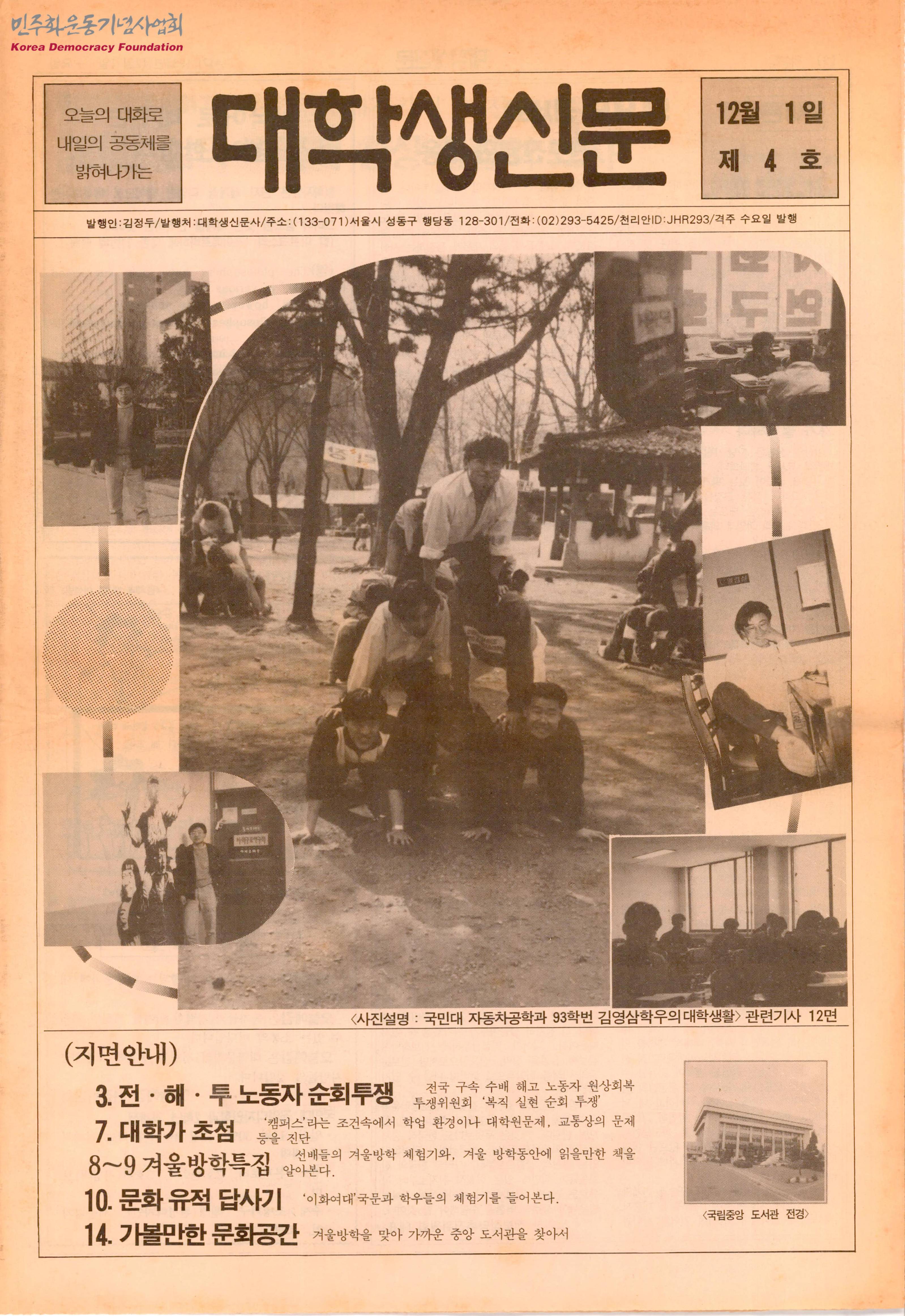 - 94년도 정세와 진보 진영의 대응, 대학생 만평 등의 내용이 수록된 정간물 주요 기사는 다음과 같음 -전·해·투 노동자 순회투쟁 -대학가 초점 -겨울방학 특집 -문화 유적 답사기 -가볼만한 문화공간