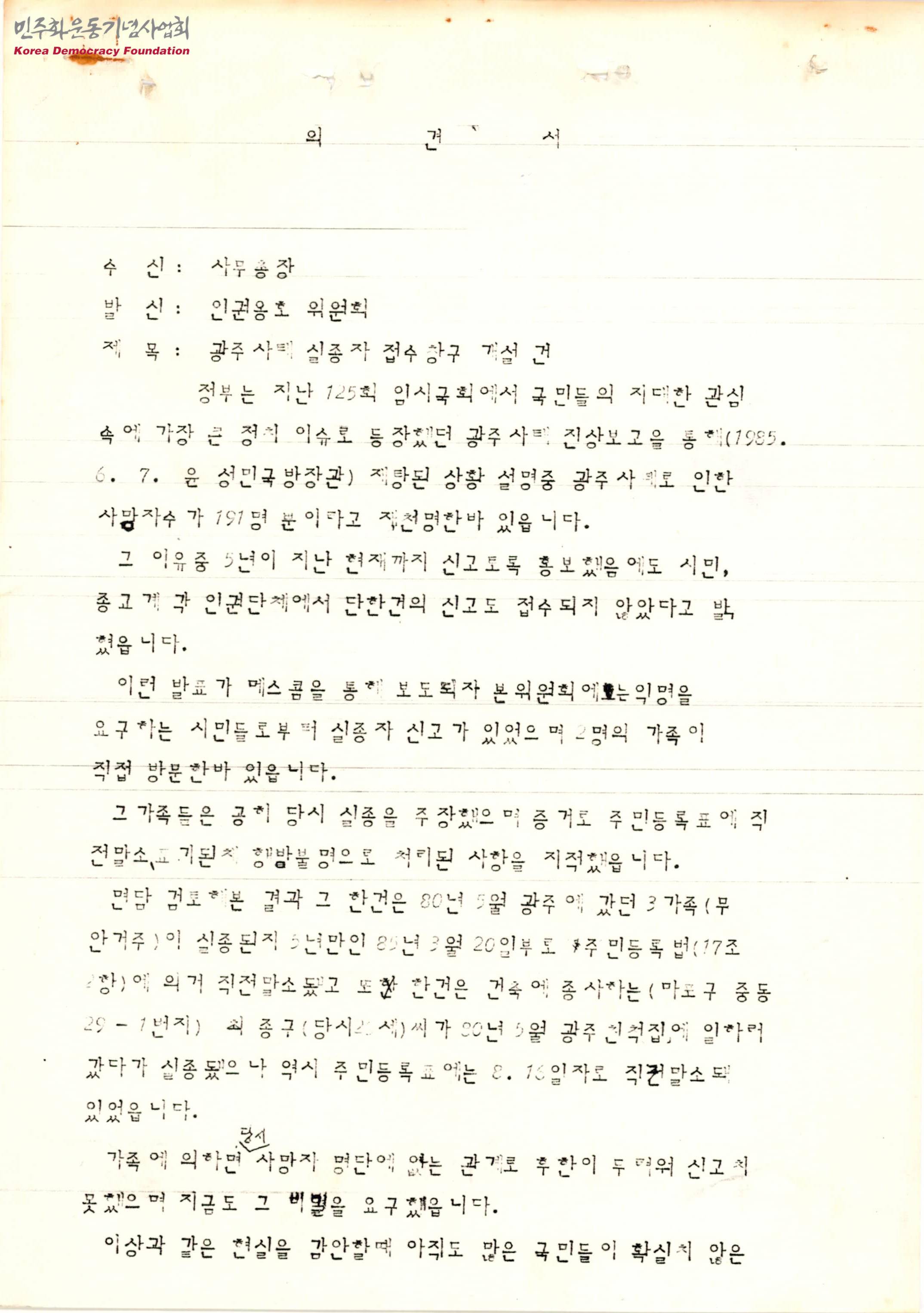 - 광주사태의 사망자수가 현실과는 다름을 지적하는 내용, 특별위원회 구성 촉구 등의 내용이 수록된 문서로 실종자 주민등록등본이 별첨되어 있음