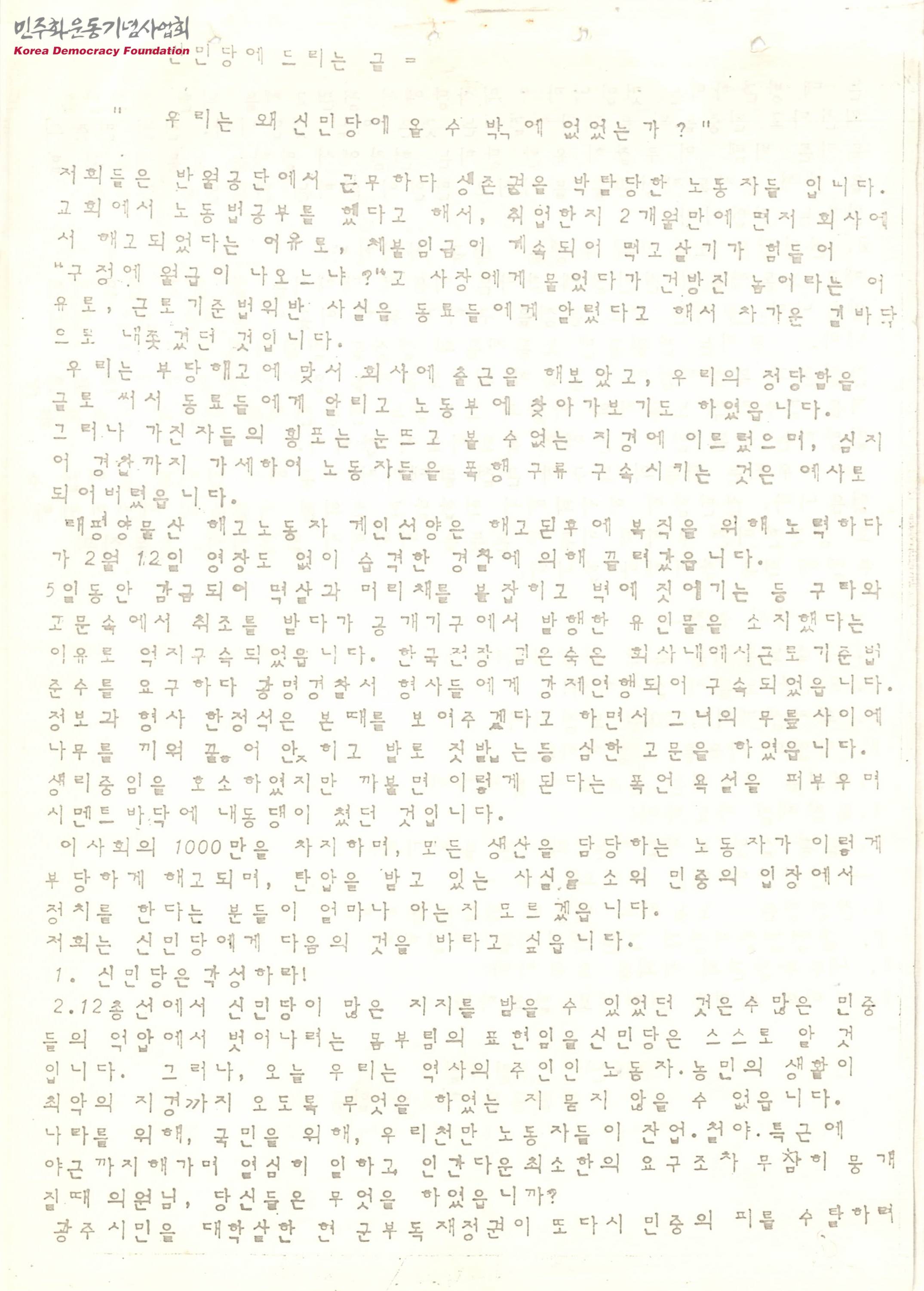 [반월공단 신민당 안양 지구당 점거 농성 관련 문서 모음]
