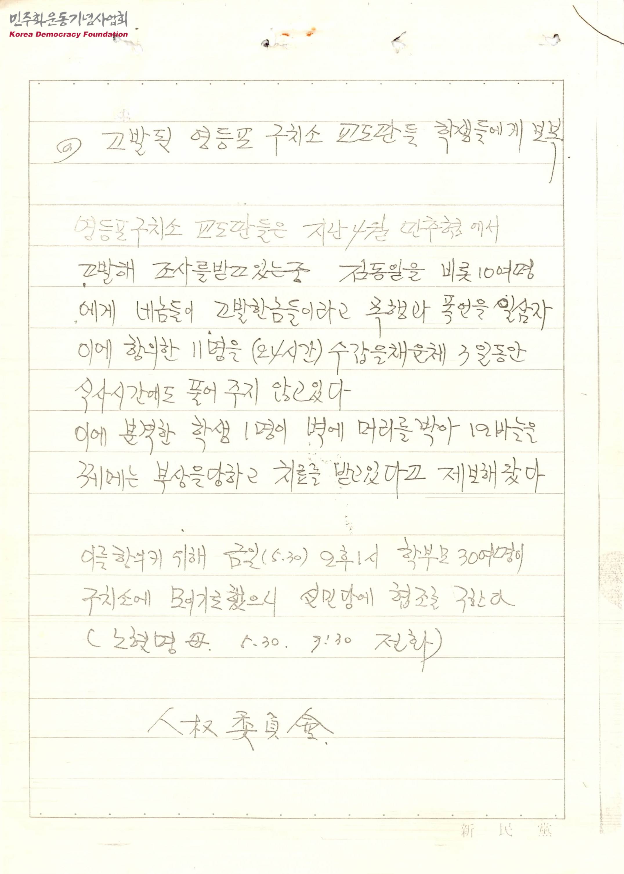 - 교도관들의 구치소 내 폭력사실, 이를 항의하기 위해 구치소에 학부모 30여명이 모인다는 내용 등이 수록된 문서