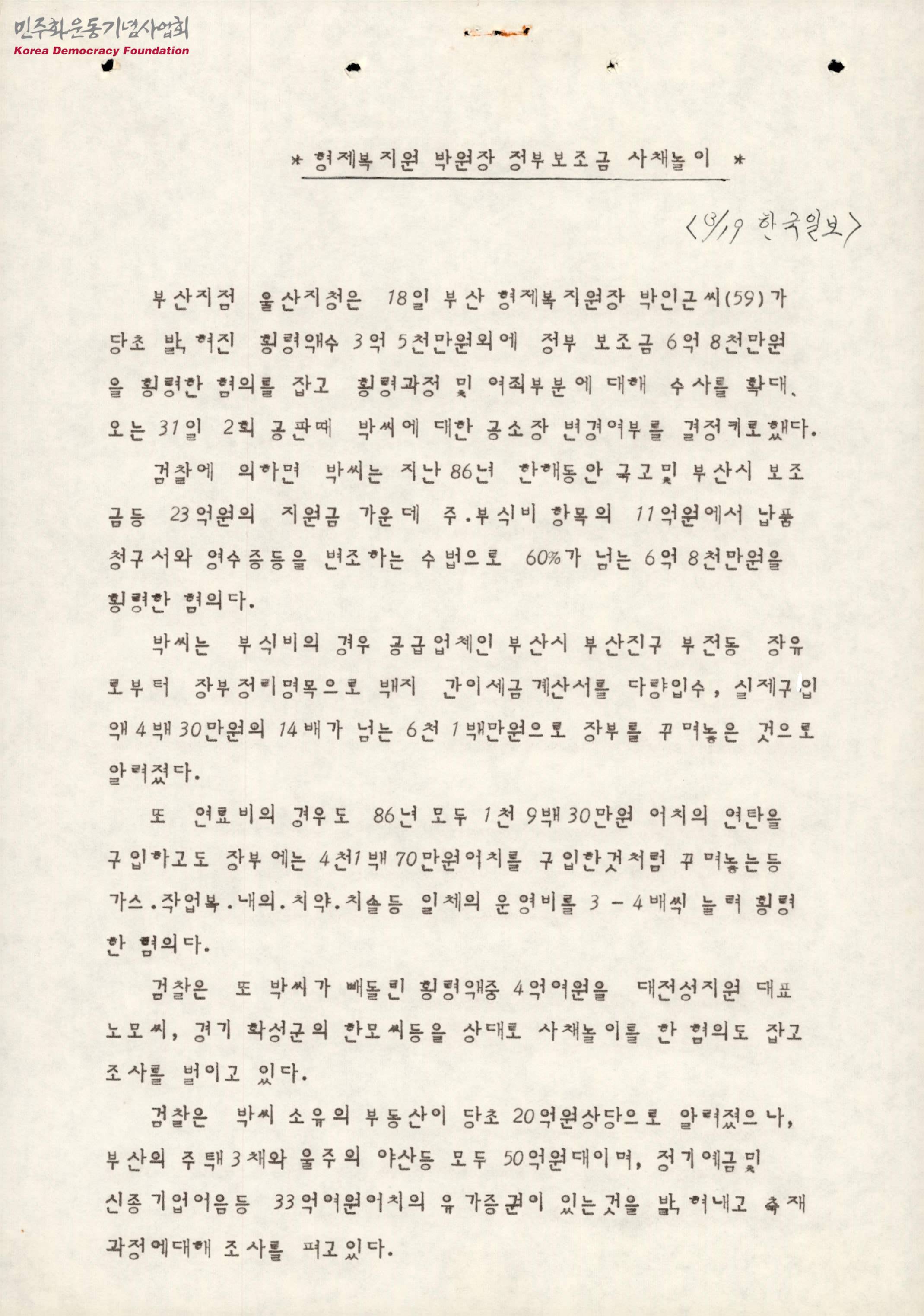 - 부산 형제복지원장 박인근이 당초 밝혀진 횡령액수 3억 5천만원 외에 정부 보조금 6억 8천만원을 횡령하여 수사를 확대, 공소장 변경여부를 결정하기로 했다는 내용이 수록된 문서