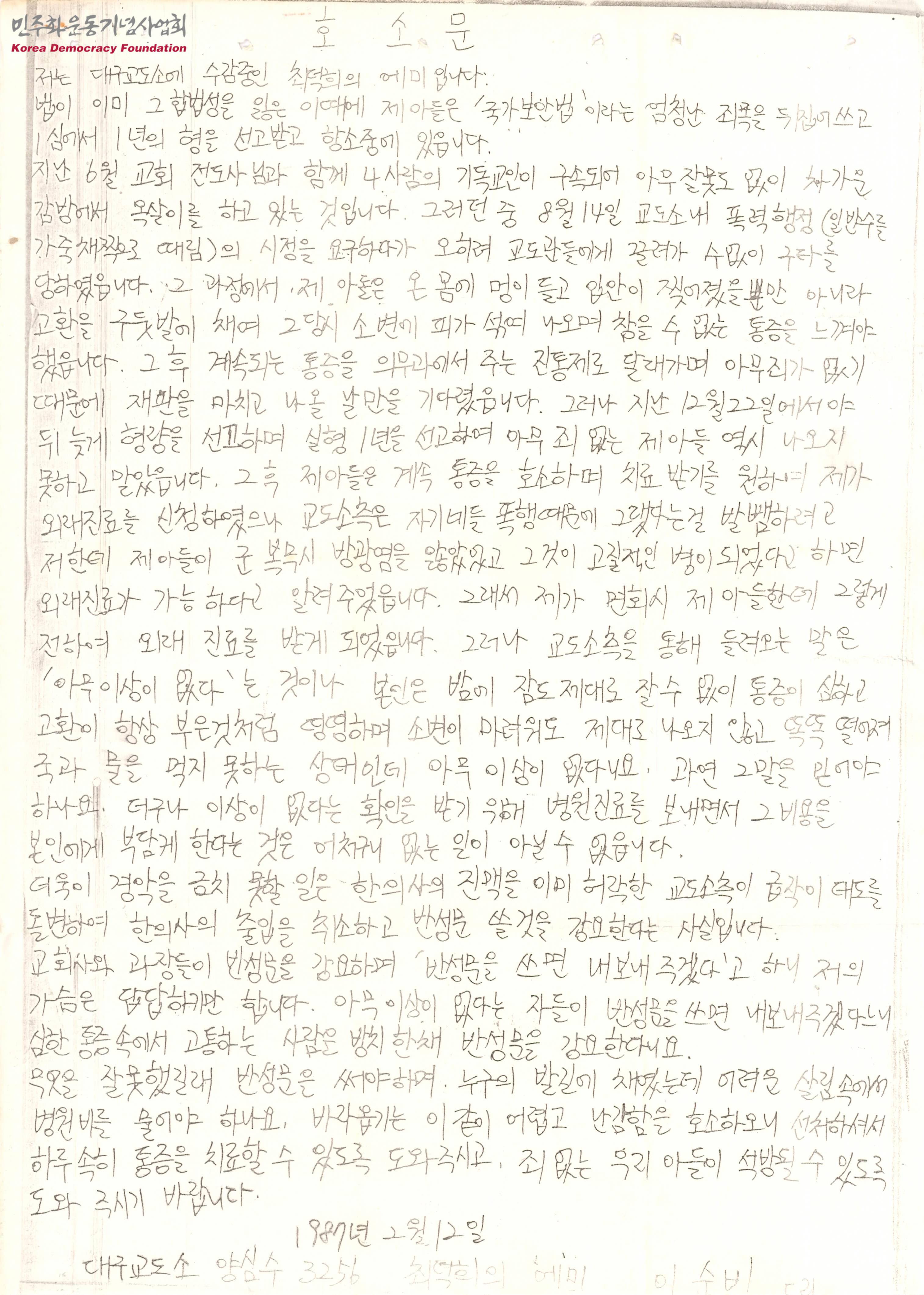 - 국가보안법 위반 혐의로 대구교도소에 수감 중인 최덕희가 교도관들에게 억울하게 인권유린을 당했으며, 교도관들이 반성문을 강요하고 있다는 내용의 호소문