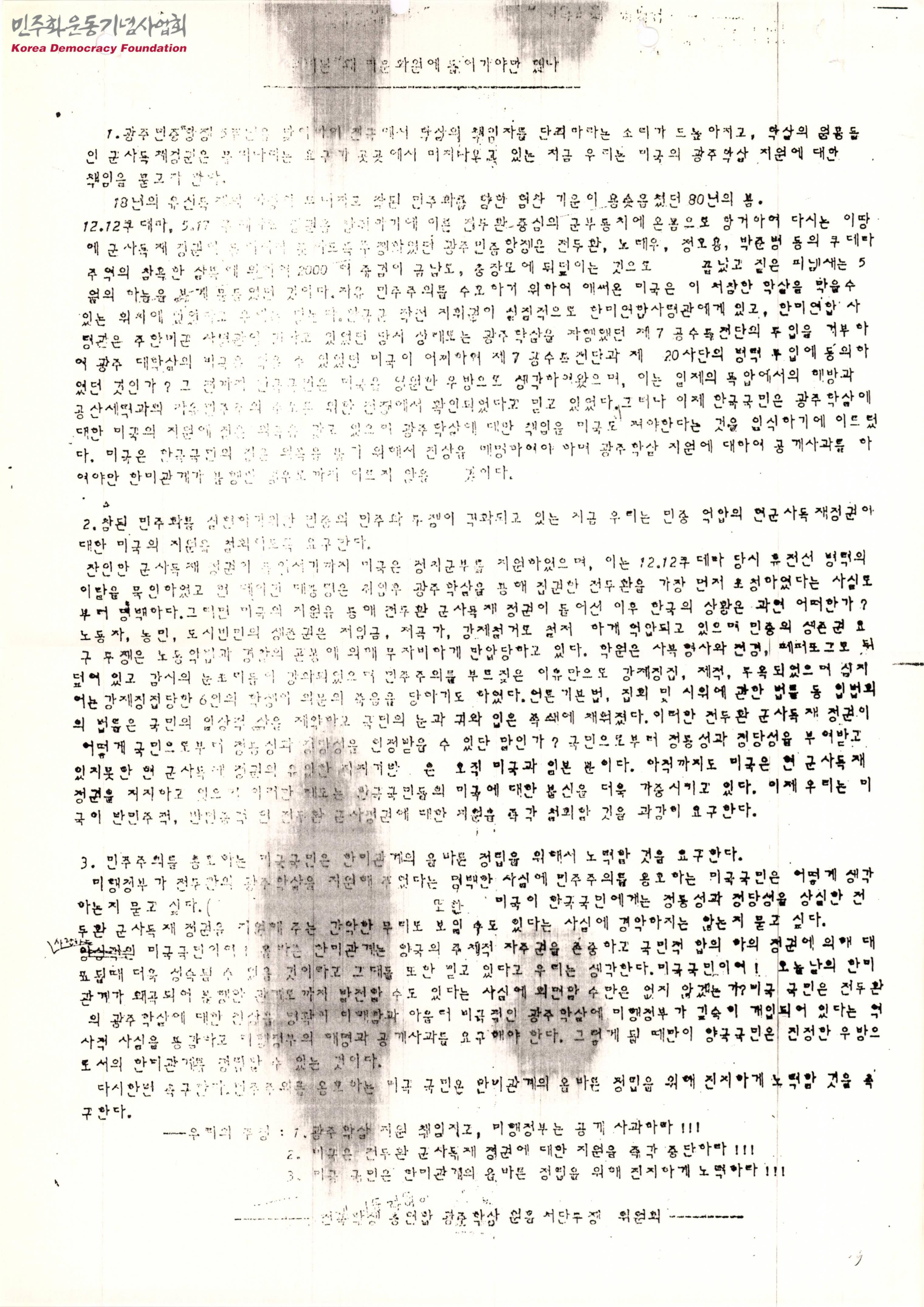 - 광주민주항쟁 5주년을 맞아 전국에서 학살의 책임자를 단죄하라는 소리가 드높아졌으며, 학살의 원흉인 군사독재정권은 물러나라는 요구가 빗발치는 가운데 그 책임을 묻는다는 내용과 함께 광주학살 지원을 책임지고 미국 국민은 한미관계의 올바른 정립을 위해 진지하게 노력하라는 내용 등이 적힌 문서