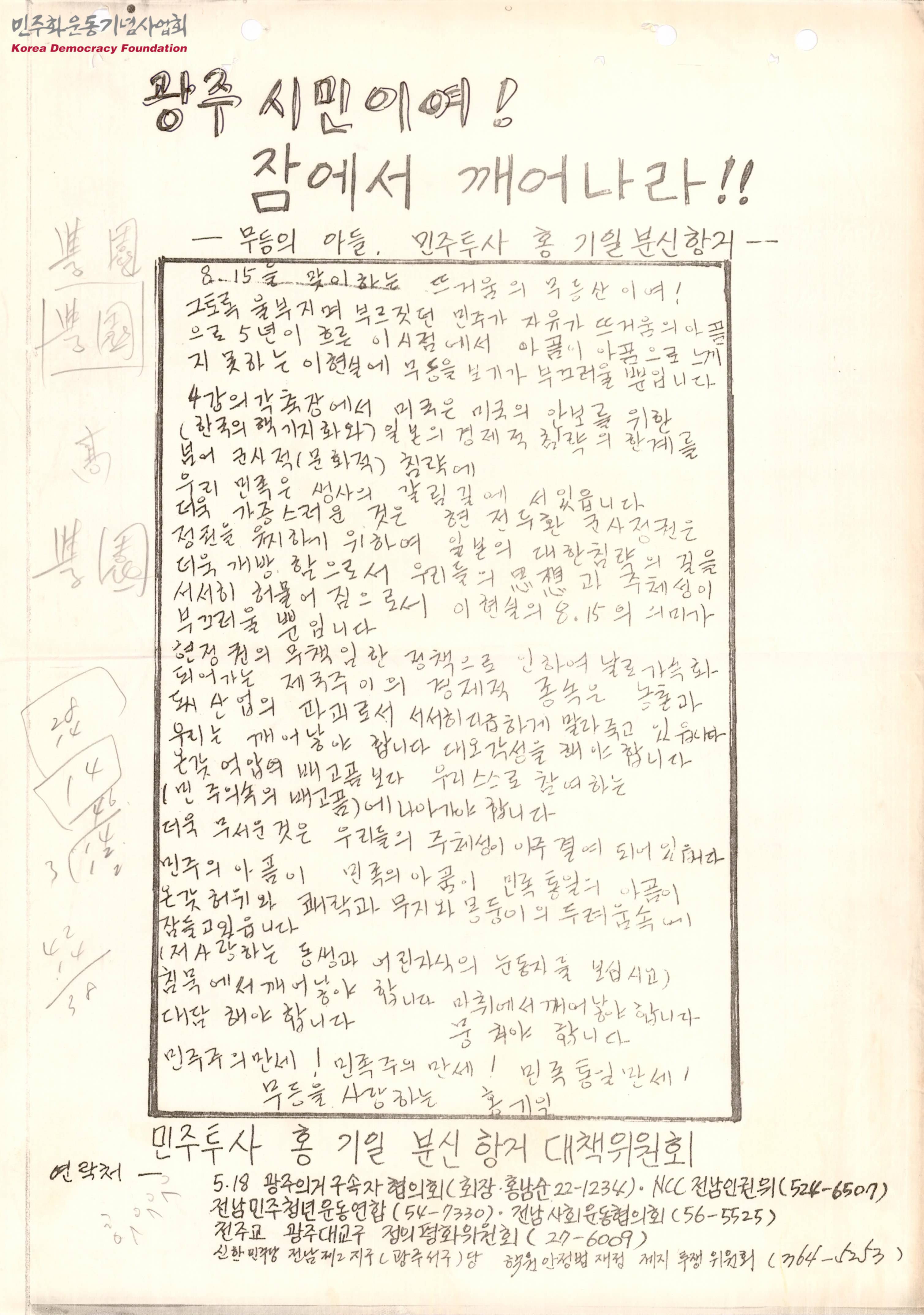광주 시민이여 잠에서 께어나라 -무등의 아들, 민주투사 홍기일 분신항거-