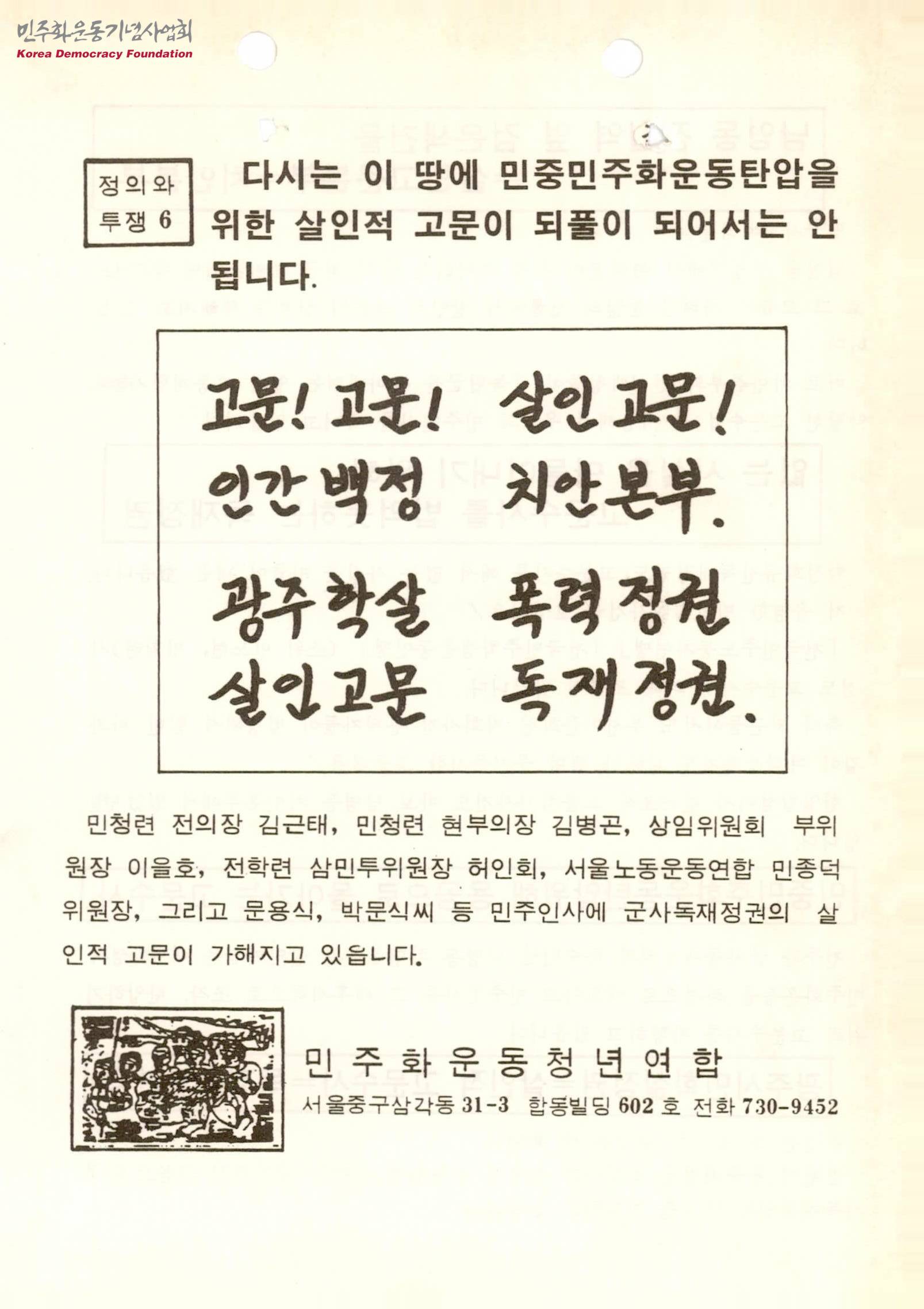 - 민주화운동청년연합의 김근태, 김병곤, 이을호 씨 등 민주인사에 군사독재정권의 살인적 고문을 폭로하며, 없는 사실을 만들어내기 위해 고문수사를 하고, 민중민주화운동탄압을 위해 용공으로 몰아가는 고문수사를 비판하는 내용 등이 수록된 문서