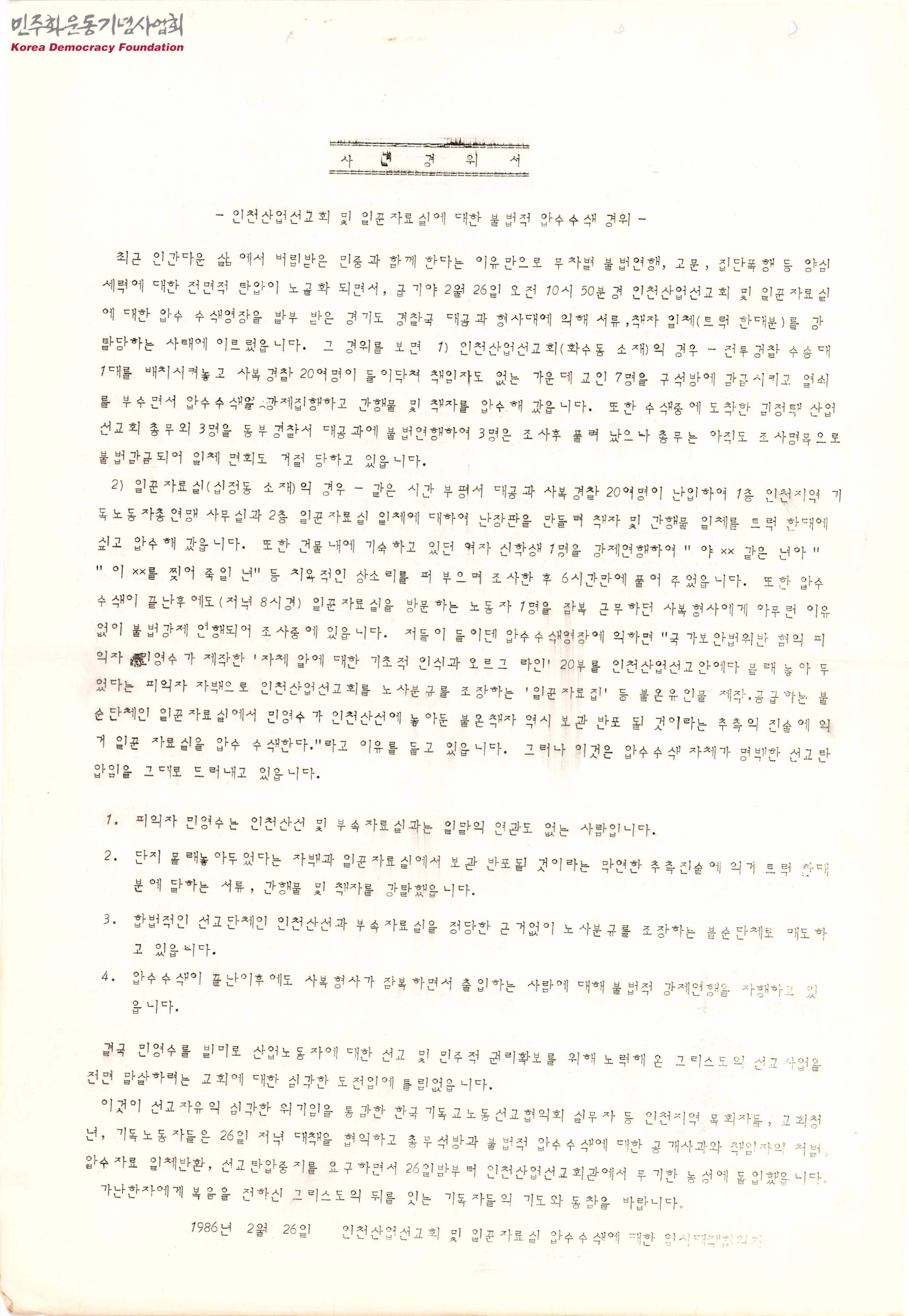 사건경위서 -인천산업선교회 및 일꾼자료실에 대한 불법적 압수수색 경위-