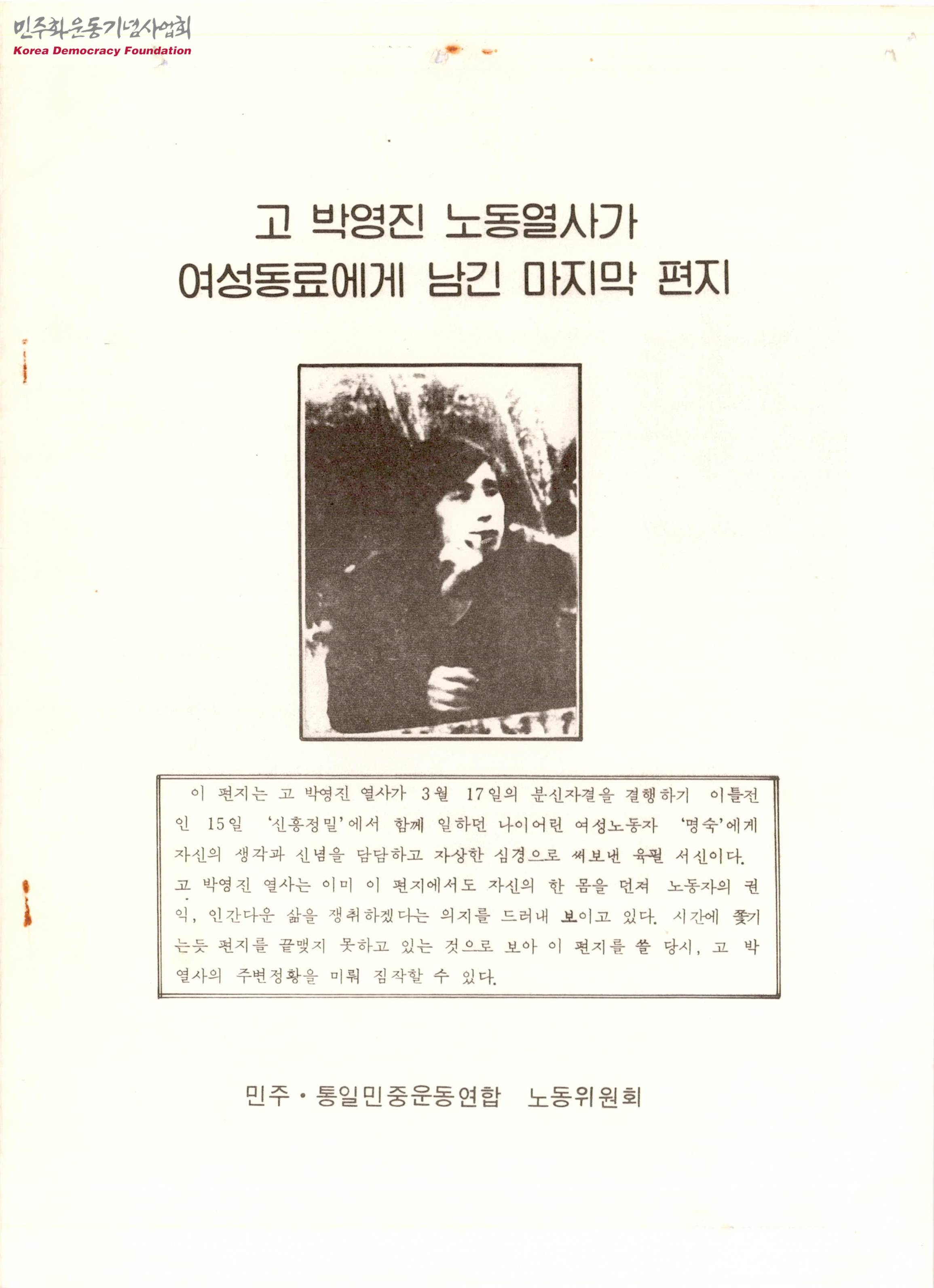 - 박영진 열사가 3월 17일 분신자결을 결행하기 이틀 전인 3월 15일 신흥정밀에서 함께 일하던 나이 어린 여성노동자 명숙에게 자신의 생각과 신념을 담담하고 자상한 심경으로 적었으며, 자신의 한 몸을 던져 노동자의 권익, 인간다움 삶을 쟁취하겠다는 내용 등이 수록된 자필문서