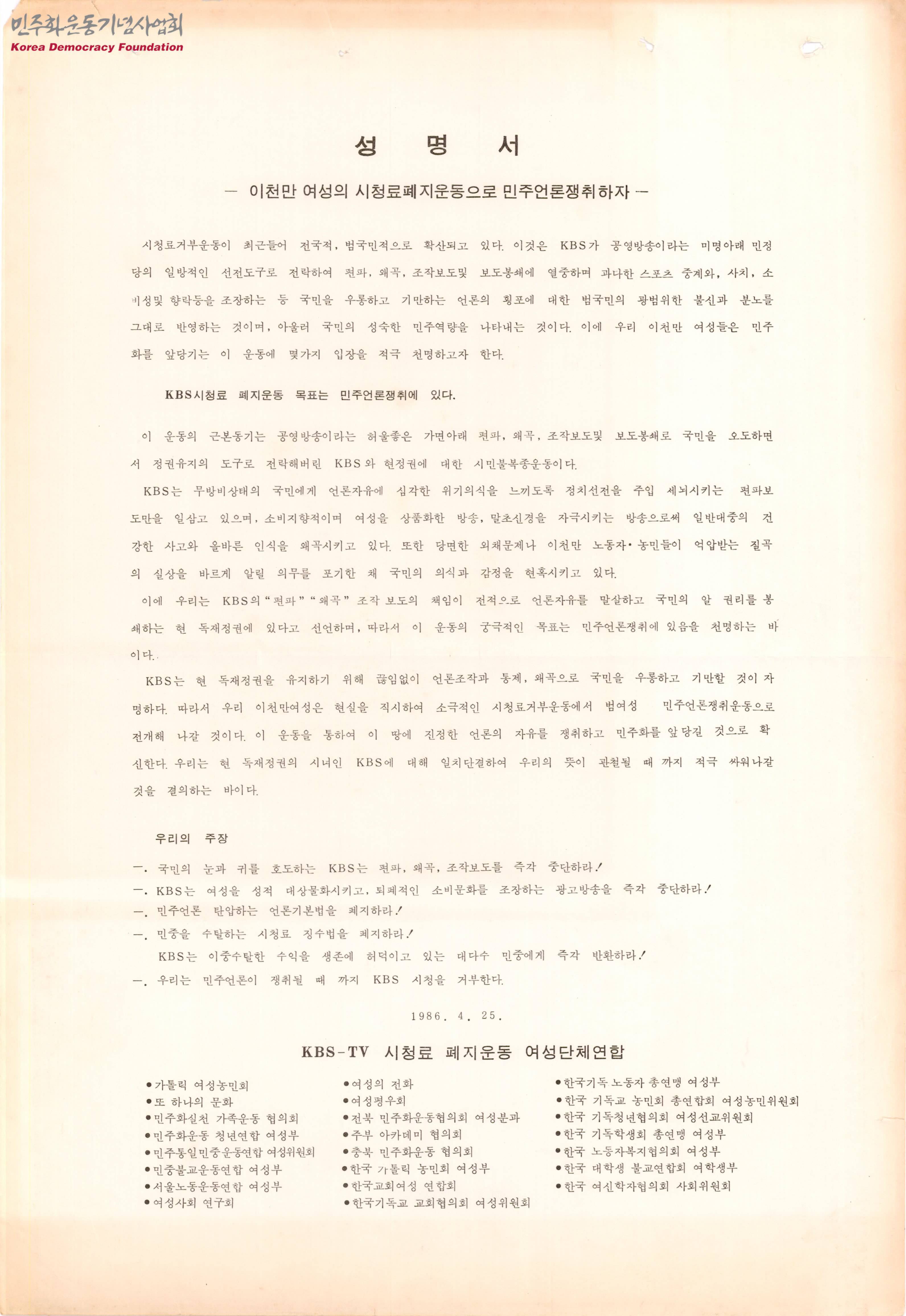 성명서 -이천만 여성의 시청료폐지운동으로 민주언론쟁취하자-