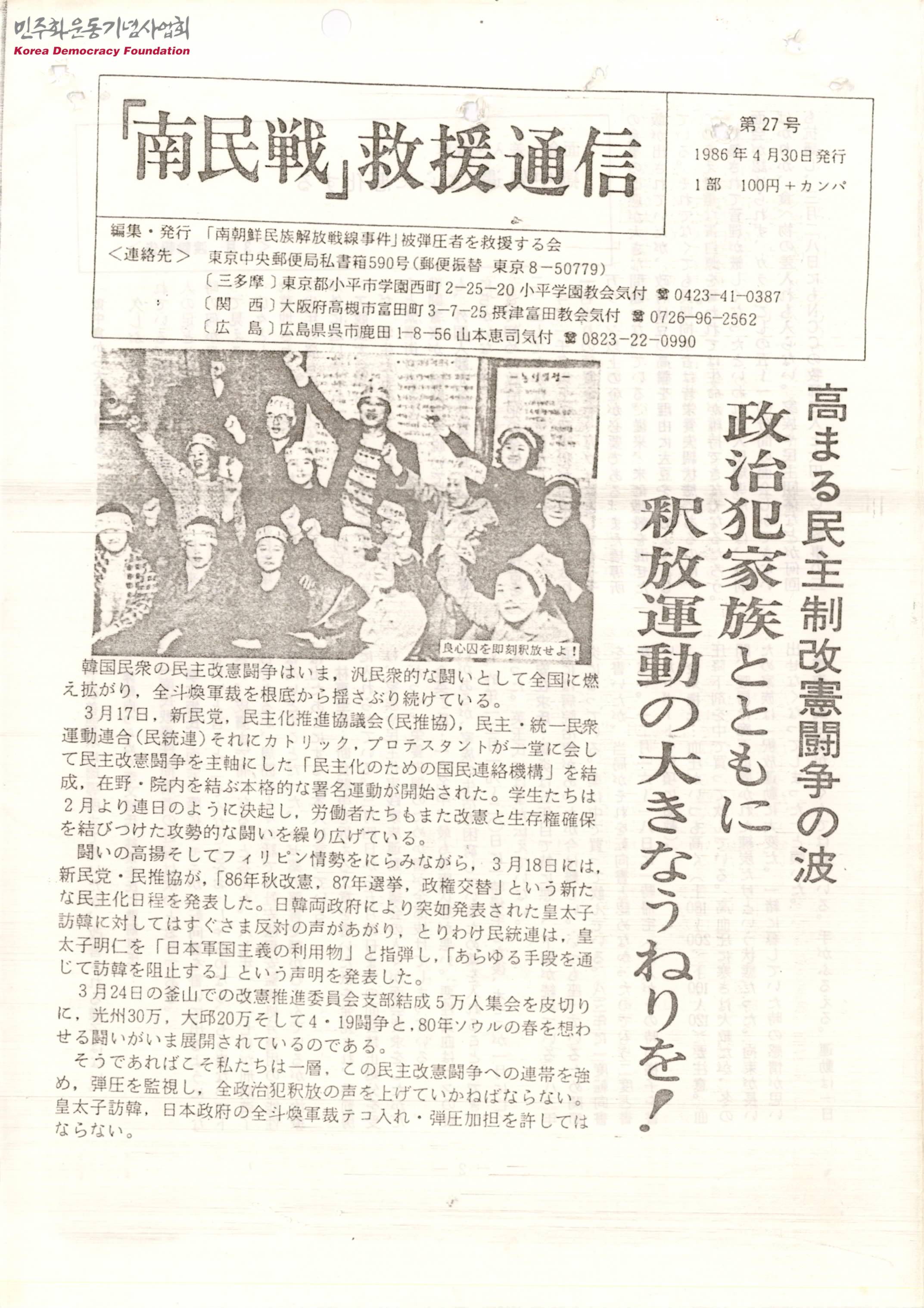 - 고조되는 민주제 개헌투쟁 물결 정치범 가족과 함께 석방운동의 큰 물결을!', '면회·차입·식사 옥중 처우가 더욱 악화되다', '옥중 정치범에 대한 잇단 중형 공격·치료 방치를 허용하지 마라!' 등의 내용이 수록된 정간물