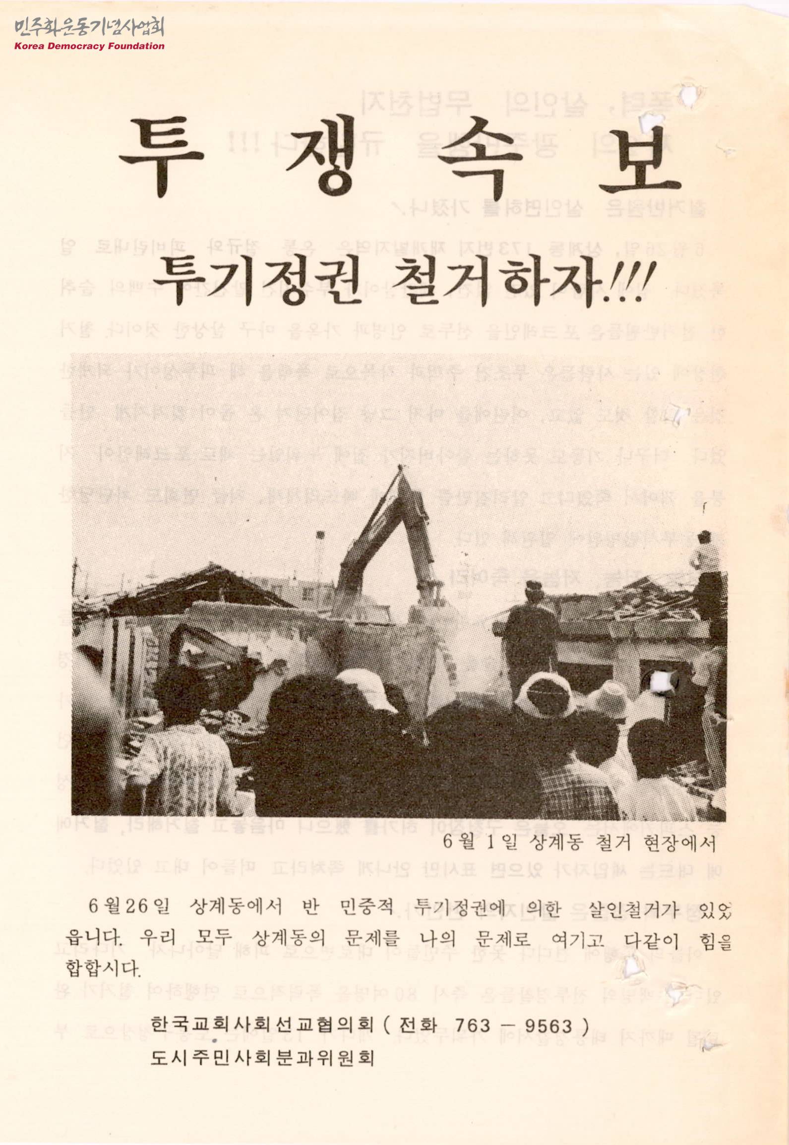 - 상계동에서 일어난 반민중적 투기정권에 의한 살인철거에 대한 내용, 오금동, 사당동, 목동 등 온천지에서 자행되는 투기, 폭력, 살인철거를 규탄하고 있으며 투기철거 강행하는 투기정권 물러나라, 가진자들 배불리는 투기철거 결사반대 등의 내용이 수록된 문서