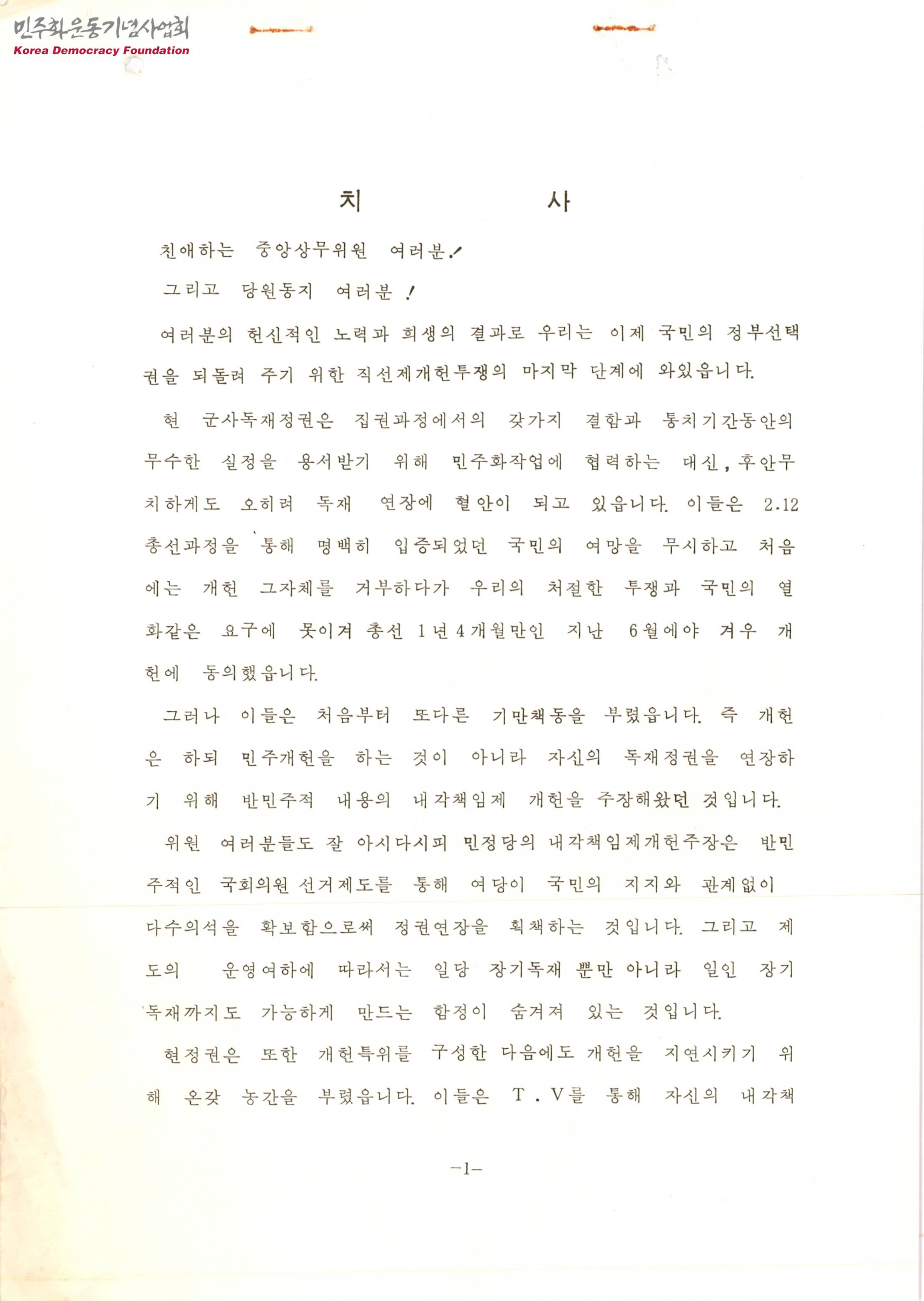 치사[독재정권에 맞서며]