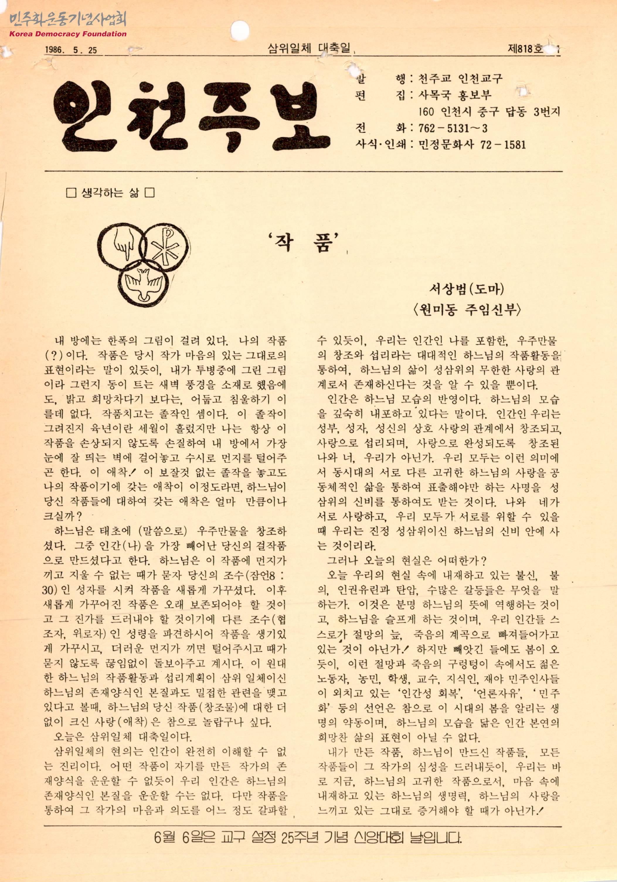 - 인권유린과 탄압 속에서 국민이 외치고 있는 인간성회복과 민주화 등의 선언은 이 시대의 봄을 알리는 삶의 표현이라는 글, 광주항쟁 추모미사에서 헌법이 보장한 종교자유가 침해되었다는 글, 교회운동의 시대구분이라는 시론 등이 수록된 주보