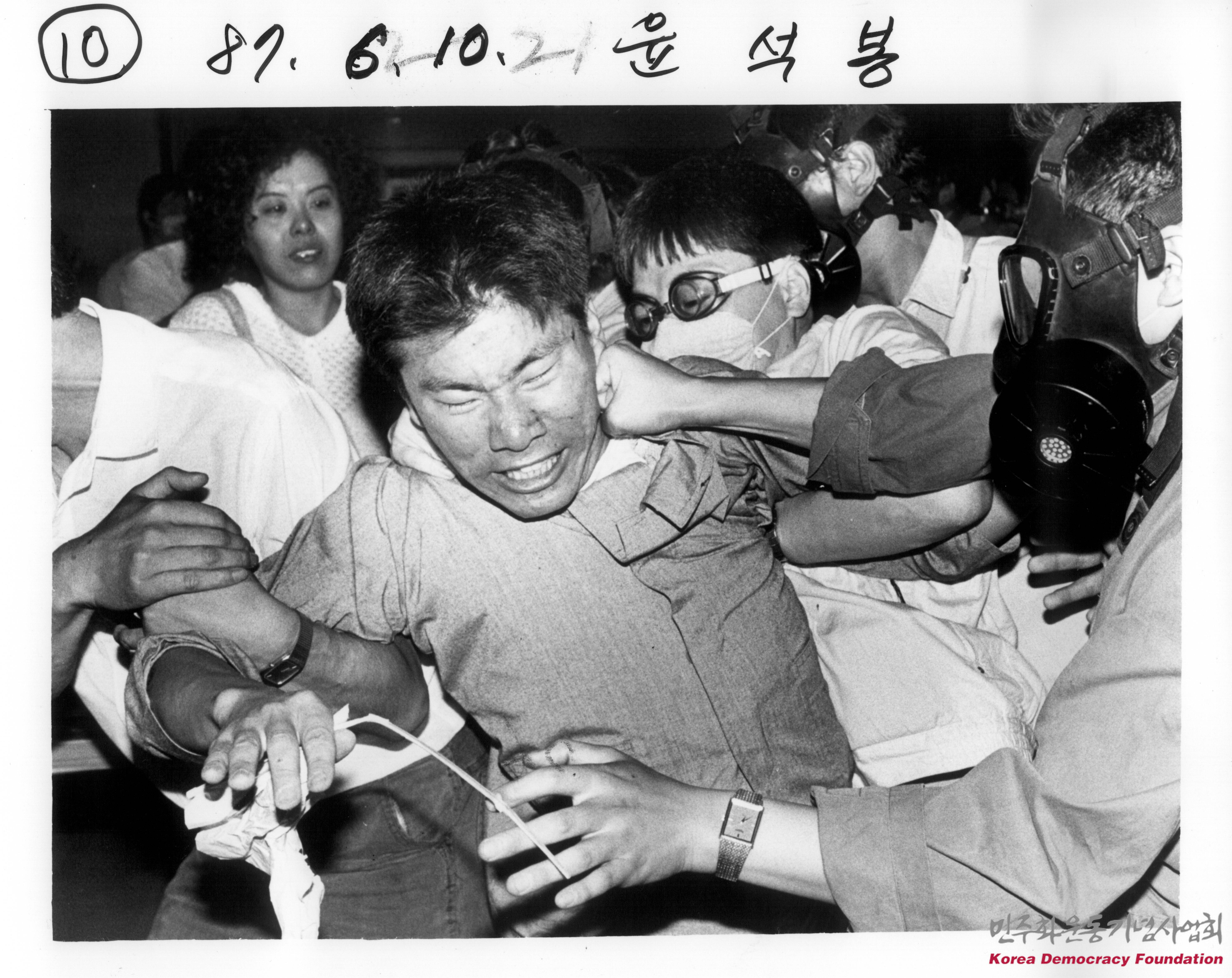 - 민주회복을 위한 정부규탄집회장에 시위진압차 출동한 경찰이 시위대원들로부터 무장이 해제된 채 공격을 받는 모습을 촬영한 사진