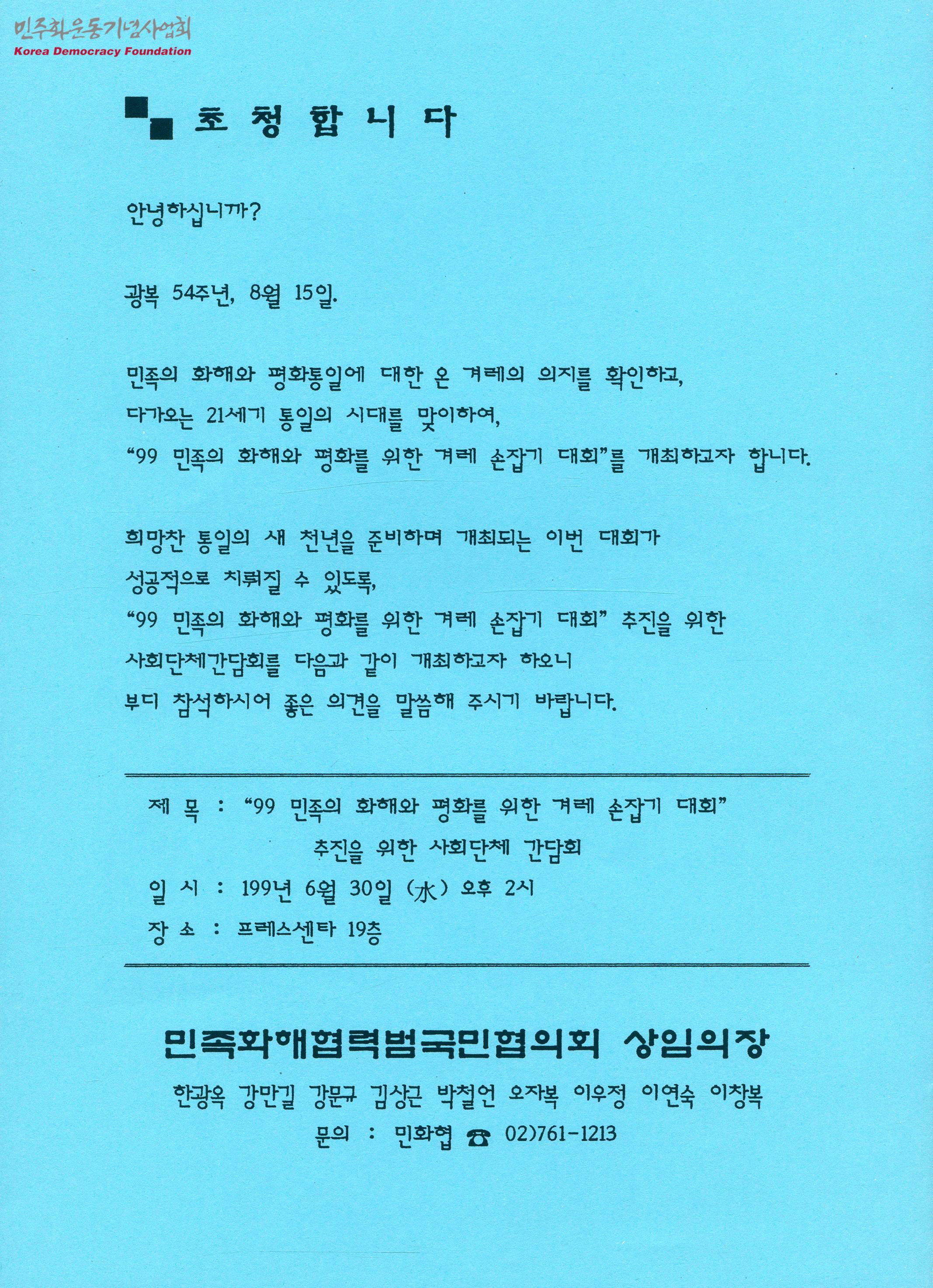 - 99 민족의 화해와 평화를 위한 겨레 손잡기 대회 추진을 위한 사회단체 간담회의 일시, 장소 등의 내용이 수록된 문서