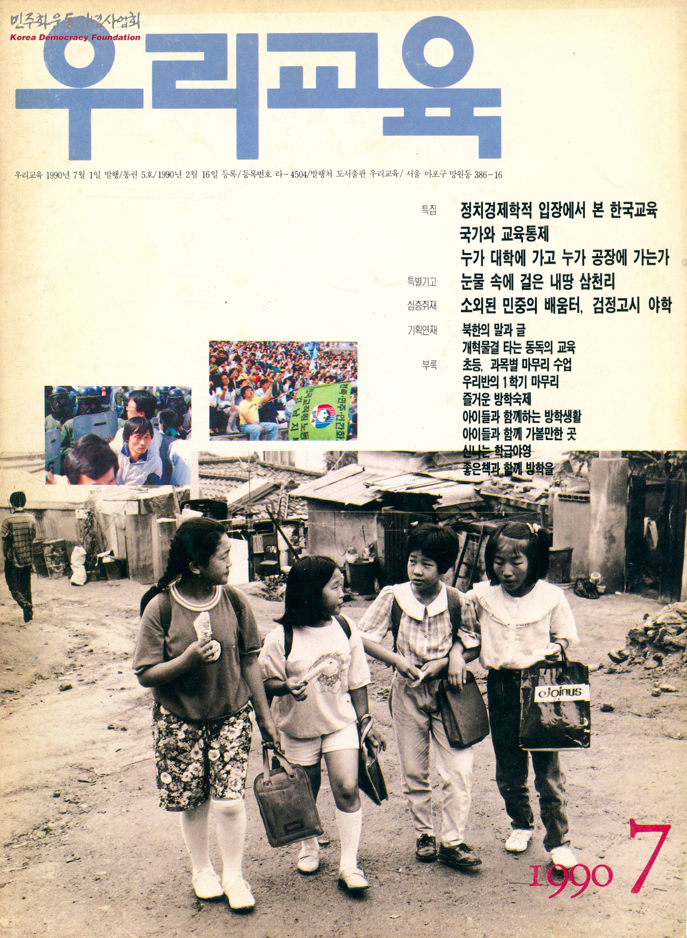 - 정치경제학적 입장에서 본 한국교육국가와 교육통제, 누가 대학에 가고 누가 공장에 가는가를 특집으로 하는 우리교육 1990년 7월호로 '눈물 속에 걸은 내땅 삼천리', '소외된 민중의 배움터, 검정고시 야학', '북한의 말과 글', '개혁물결 타는 동독의 교육' 등의 내용이 수록된 정간물