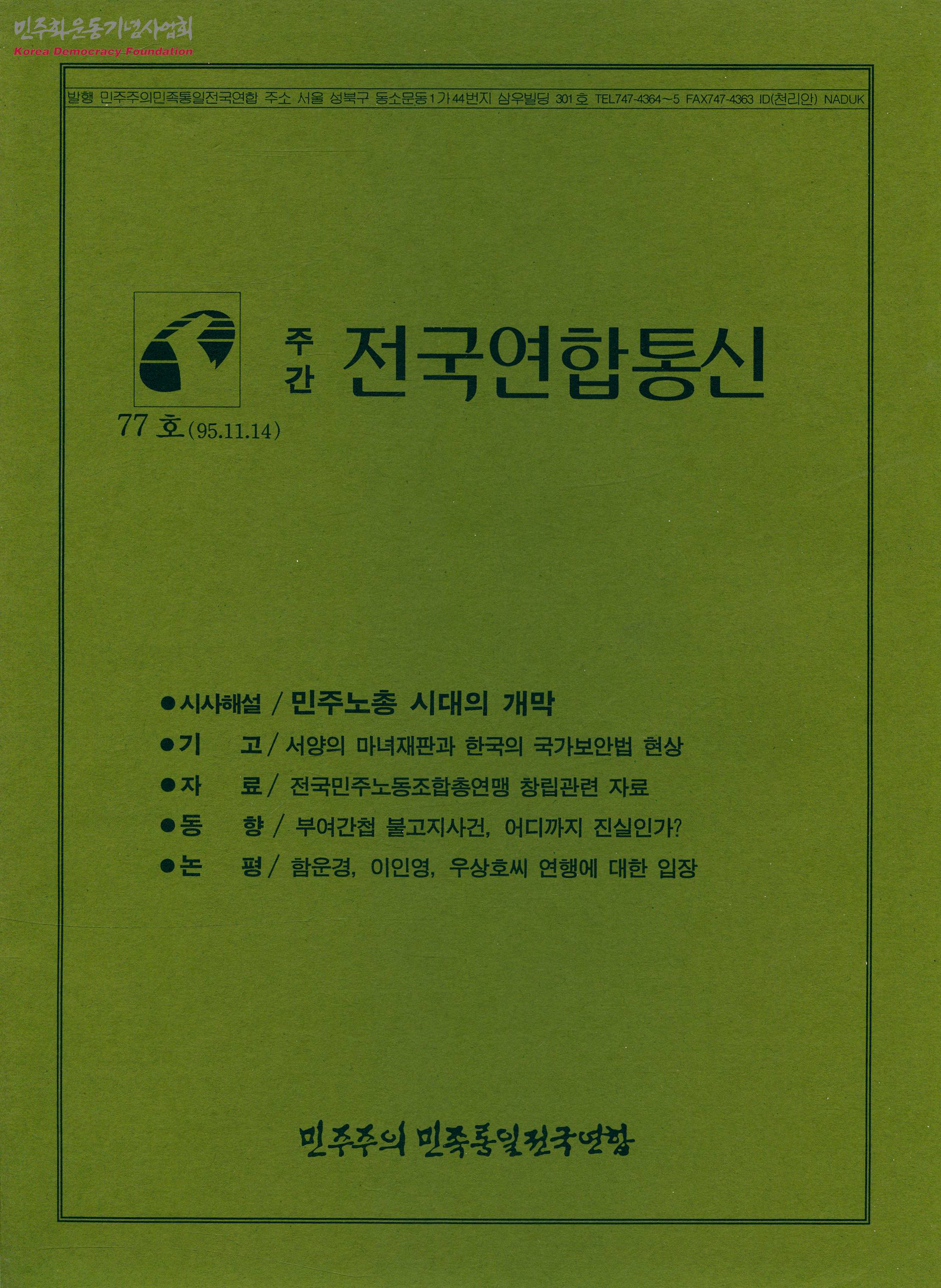 - 민주노총과 부여간첩 불고지사건 관련 내용의 정간물로 주요 목차는 다음과 같음 - 시사해설/민주노총 시대의 개막 - 기고/서양의 마녀재판과 한국의 국가보안법 현상 - 자료/전국민주노동조합총연맹 창립관련 자료 - 동향/부여간첩 불고지사건, 어디까지 진실인가? - 논평/함운경, 이인영, 우상호씨 연행에 대한 입장