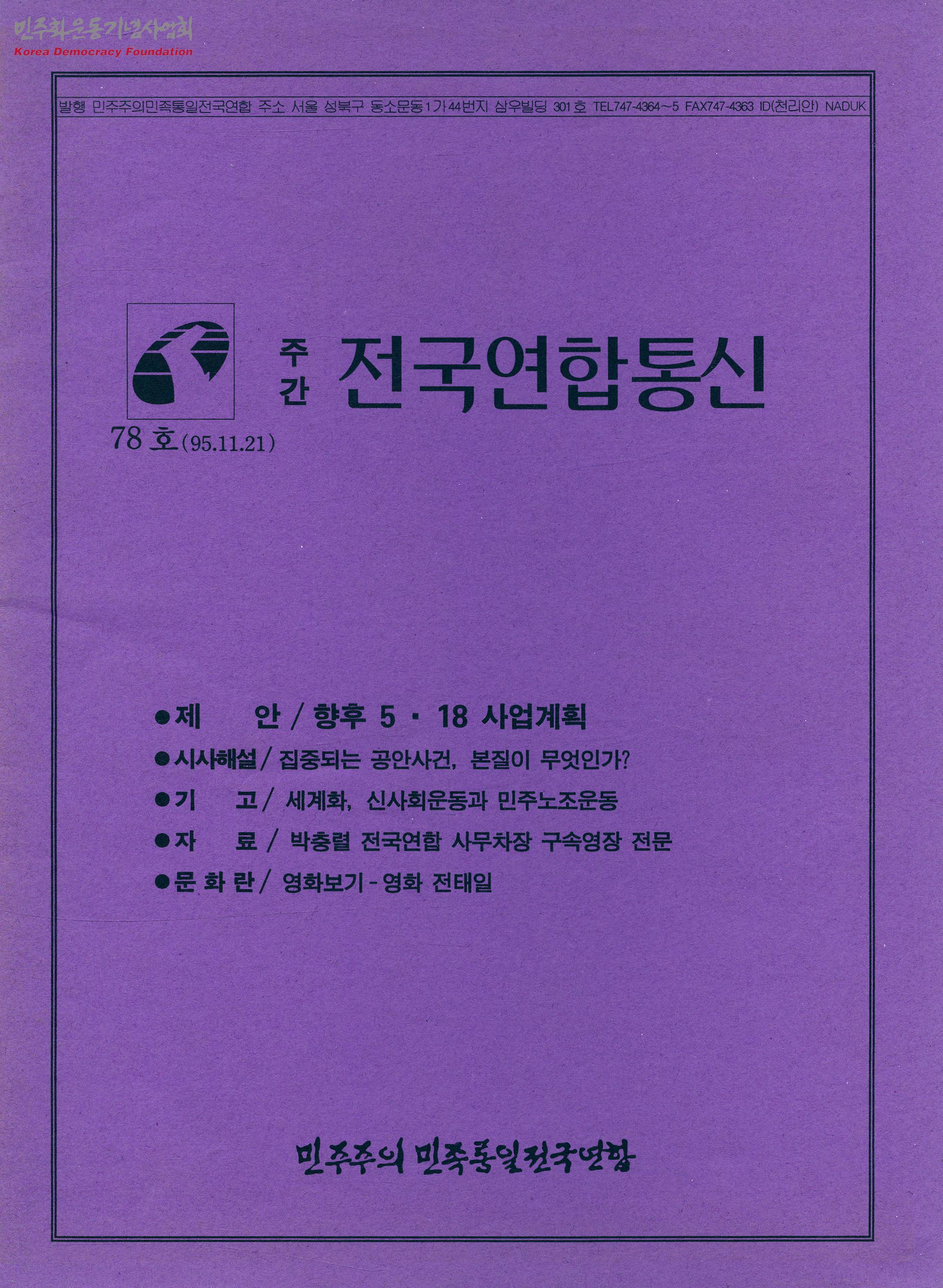 - 박충렬 구속영장과 영화 전태일 관련 내용의 정간물로 주요 목차는 다음과 같음 - 제안/향후 5·18 사업계획 - 시사해설/집중되는 공안사건, 본질이 무엇인가? - 기고/세계화, 신사회운동과 민주노조운동 - 자료/박충렬 전국연합 사무차장 구속영장 전문 - 문화란/영화보기 - 영화 전태일