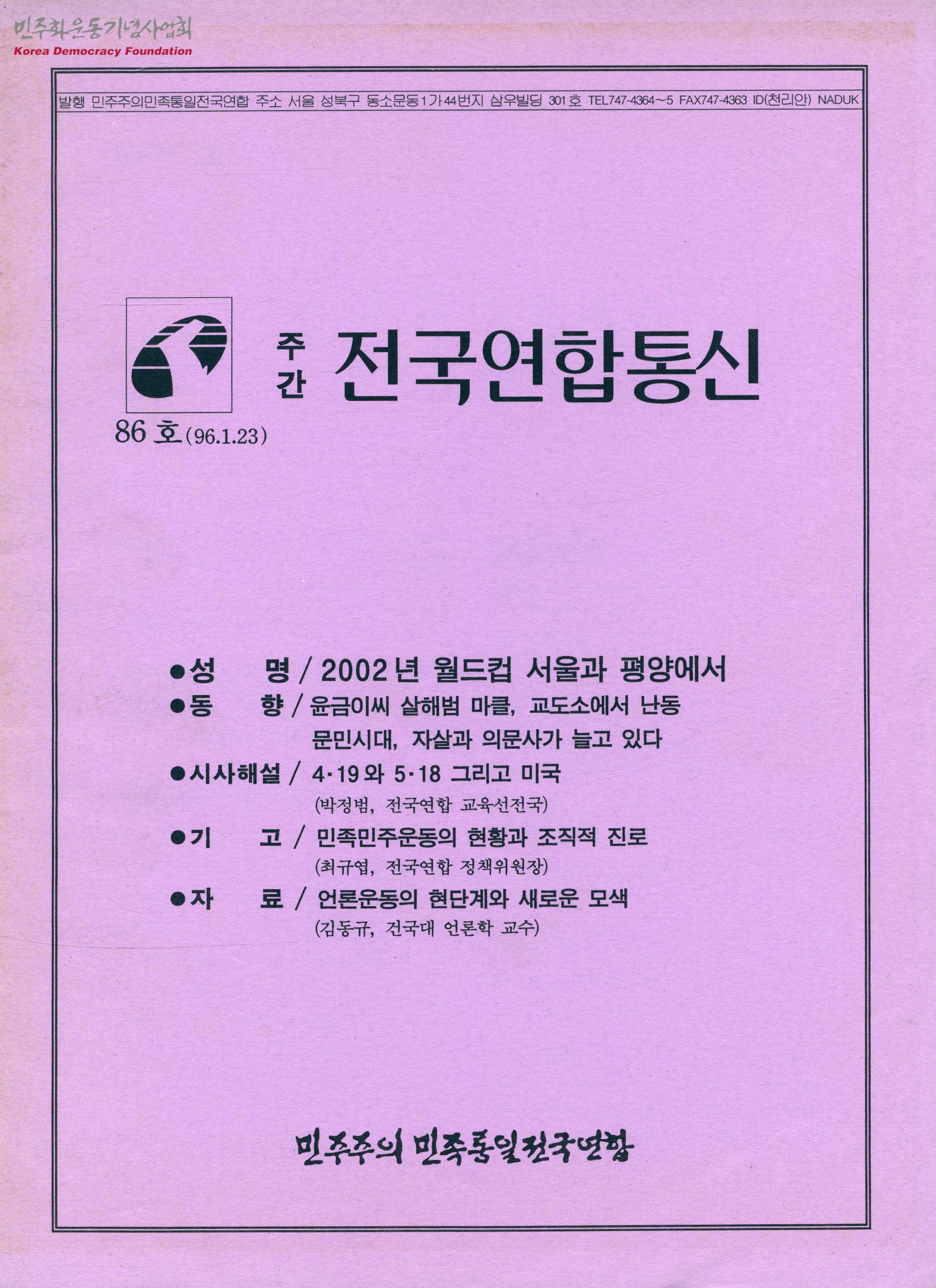 - 윤금이씨 살해범 마클과 민족민주운동 현황 관련 내용의 정간물로 주요 목차는 다음과 같음 - 성명/2002년 월드컵 서울과 평양에서 - 동향/윤금이씨 살해범 마클, 교도소에서 난동 문민시대, 자살과 의문사가 늘고 있다 - 시사해설/4·19와 5·18 그리고 미국 - 기고/민족민주운동의 현황과 조직적 진로 - 자료/언론운동의 현단계와 새로운 모색