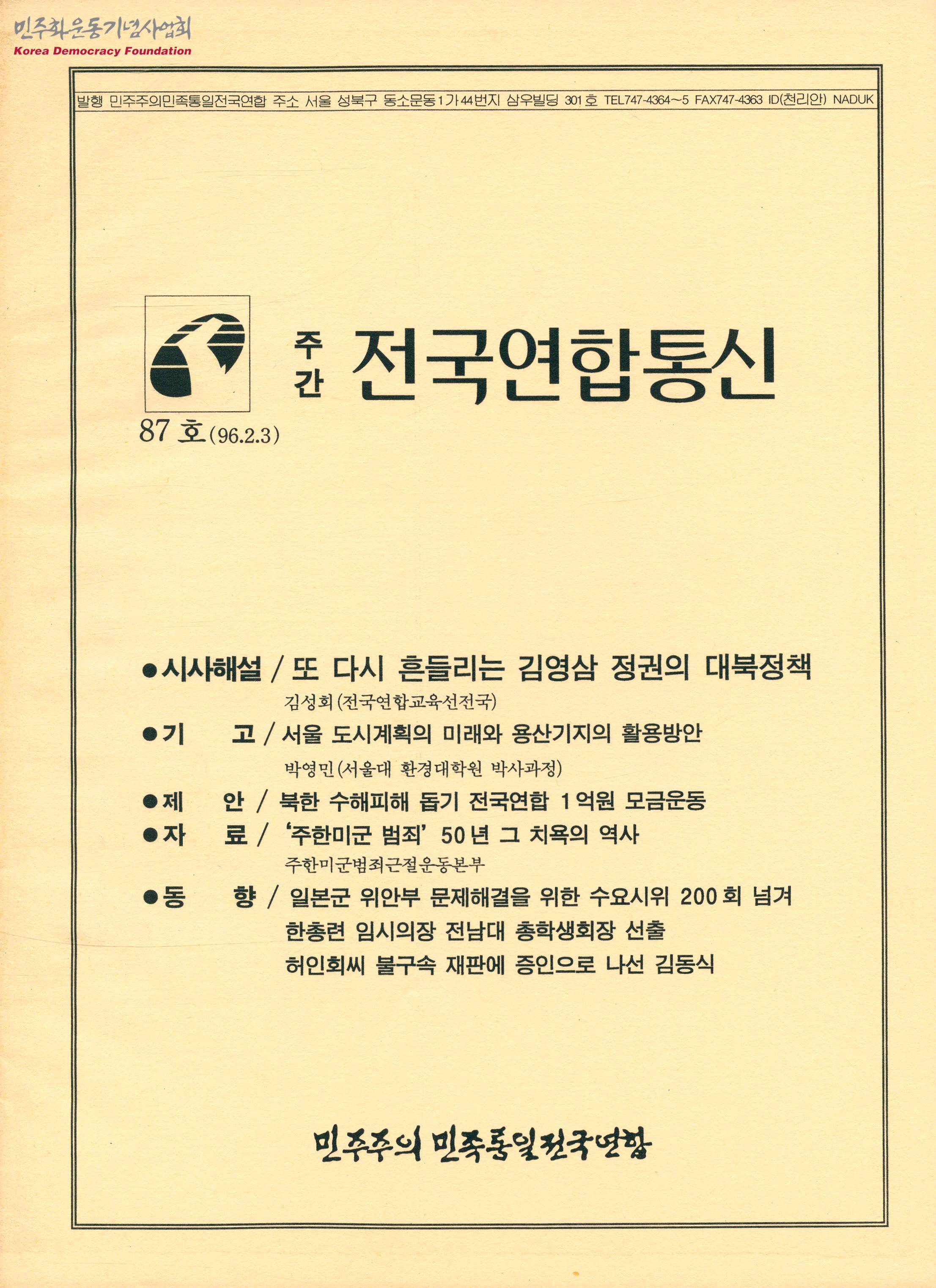 - 김영삼 정권의 대북정책과 북한수해 돕기 모금운동 관련 내용의 정간물로 주요 목차는 다음과 같음 - 시사해설/또 다시 흔들리는 김영삼 정권의 대북정책 - 기고/서울 도시계획의 미래와 용산기지의 활용방안 - 제안/북한 수해피해 돕기 전국연합 1억원 모금운동 - 자료/'주한미군 범죄' 50년 그 치욕의 역사 - 동향/일본군 위안부 문제해결을 위한 수요시위 200회 넘겨 한총련 의장 전남대 총학생회장 선출 허인회씨 불구속 재판에 증인으로 나선 김동식