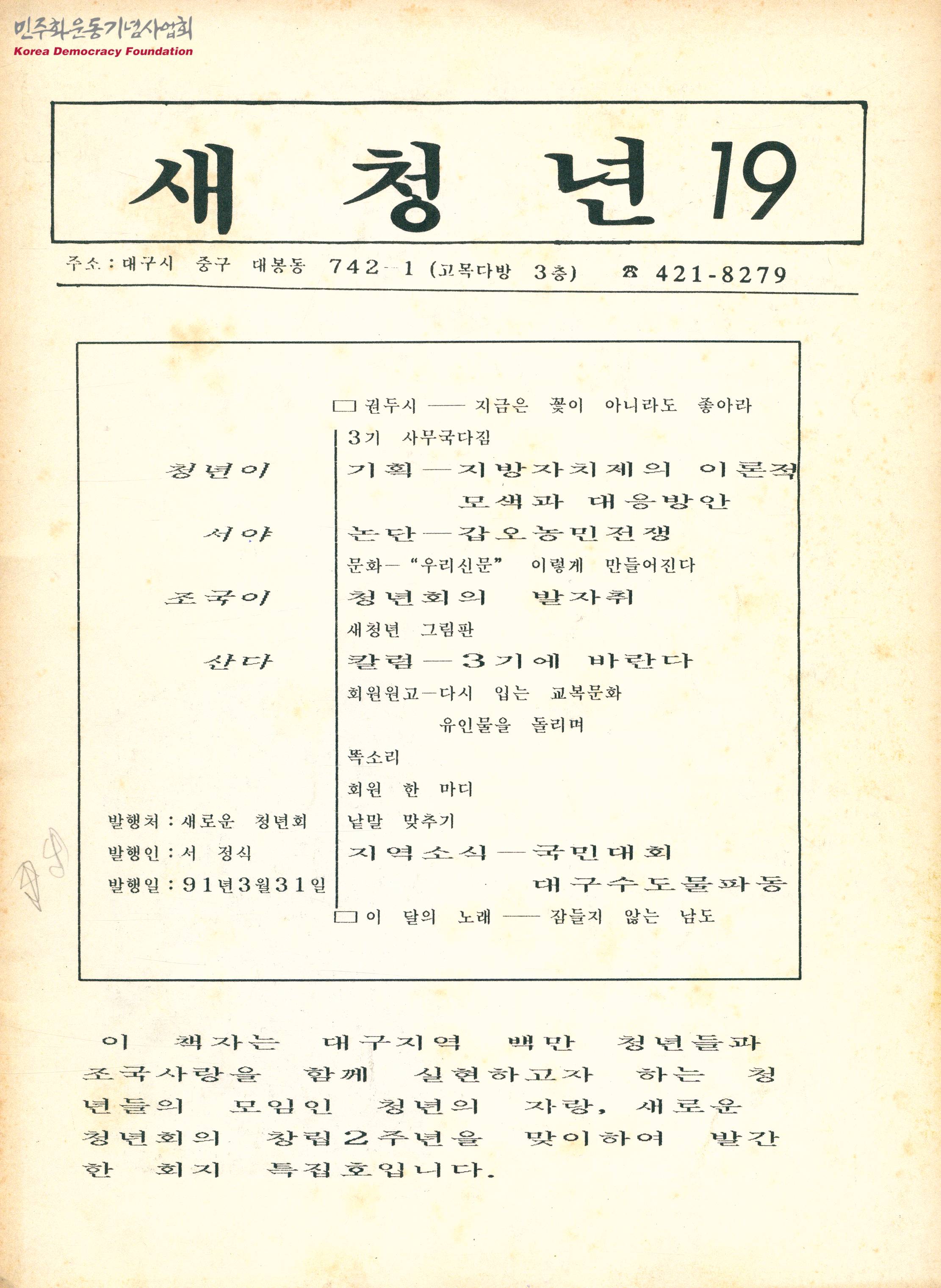 - 지방자치제와 농민전쟁 등의 내용을 다룬 정간물로 목차는 다음과 같음 - 권두시 : 지금은 꽃이 아니라도 좋아라 - 3기 사무국 다짐 - 기획 : 지방자치제의 이론적 모색과 대응방안 - 논단 : 갑오농민전쟁 - 문화 : "우리신문" 이렇게 만들어진다 - 청년회의 발자취 - 새청년 그림판 - 칼럼 : 3기에 바란다 - 회원원고 : 다시 입는 교복문화 / 유인물을 돌리며 - 똑소리 - 회원 한 마디 - 낱말 맞추기 - 지역소식 : 국민대회 대구수도물파동 - 이 달의 노래 : 잠들지 않는 남도