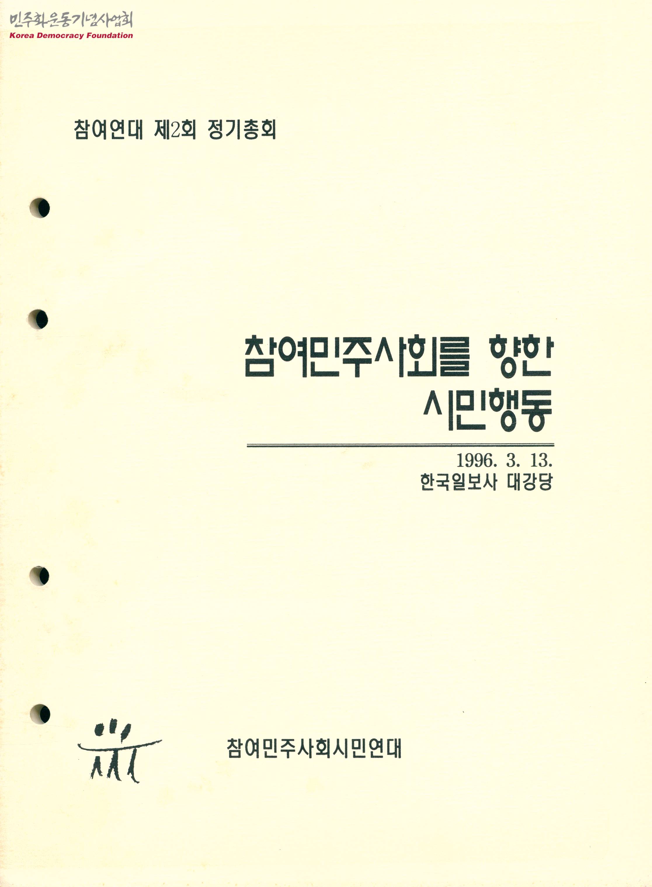 - 참여민주사회시민연대 제2회 정기총회 자료집으로 식순은 다음과 같음 제1부 총회 - 개회선언 - 국민의례 - 감사상 증정 - 대회사 - 사업보고 - 안건심의 - 공동대표 취임사 - 임원 인사 및 폐회사 제2부 회원친교 - 회원 3분 발언 - 담소 - 상근자 전원 인사 및 다함께 노래