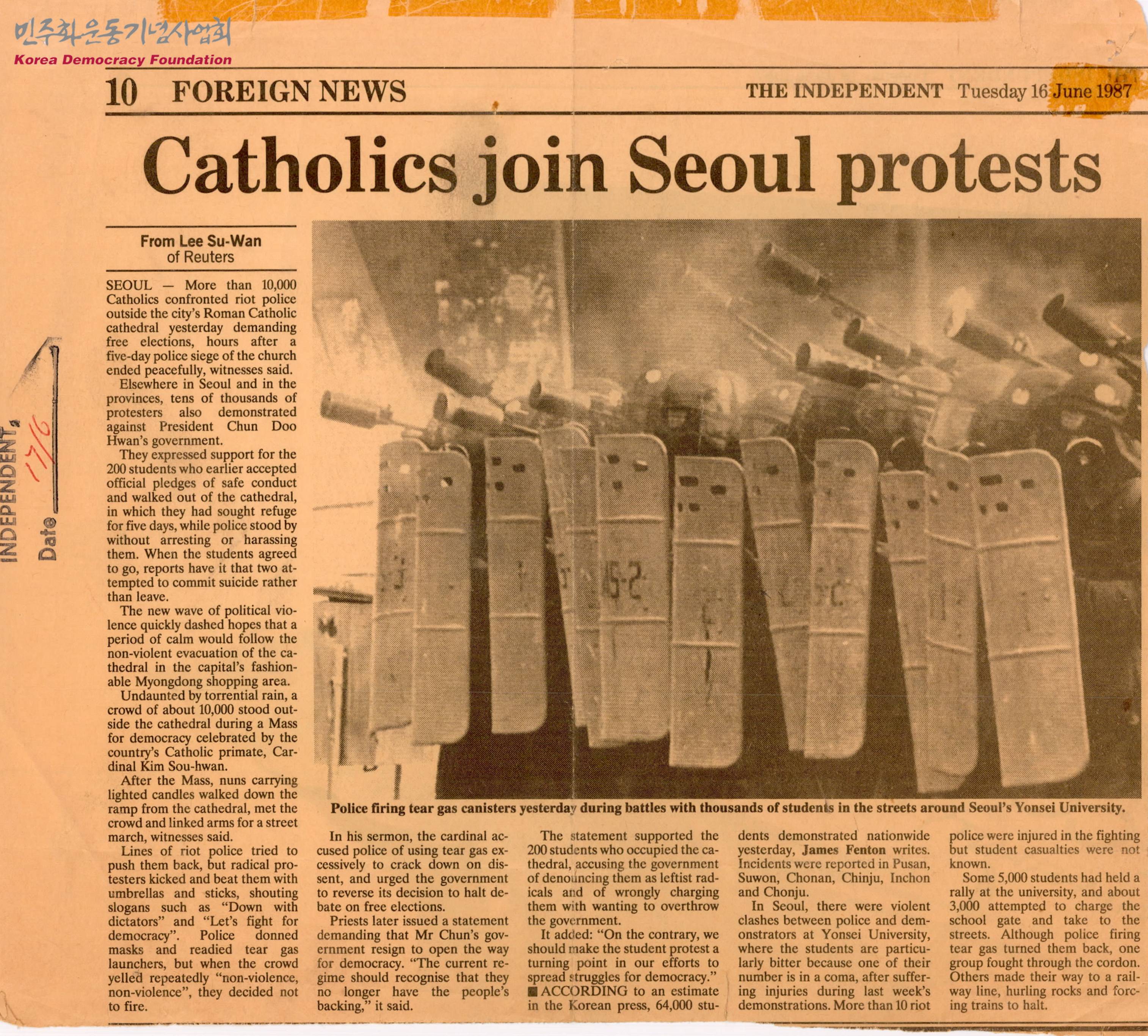 - 5일 간의 경찰의 포위공격이 끝난지 몇 시간 후 1만 명 이상의 가톨릭 신자들이 자유선거를 요구하며 전경들과 대치했다는 것, 김수환 추기경이 경찰의 최루탄 사용을 비판했다는 내용 등이 수록된 신문스크랩