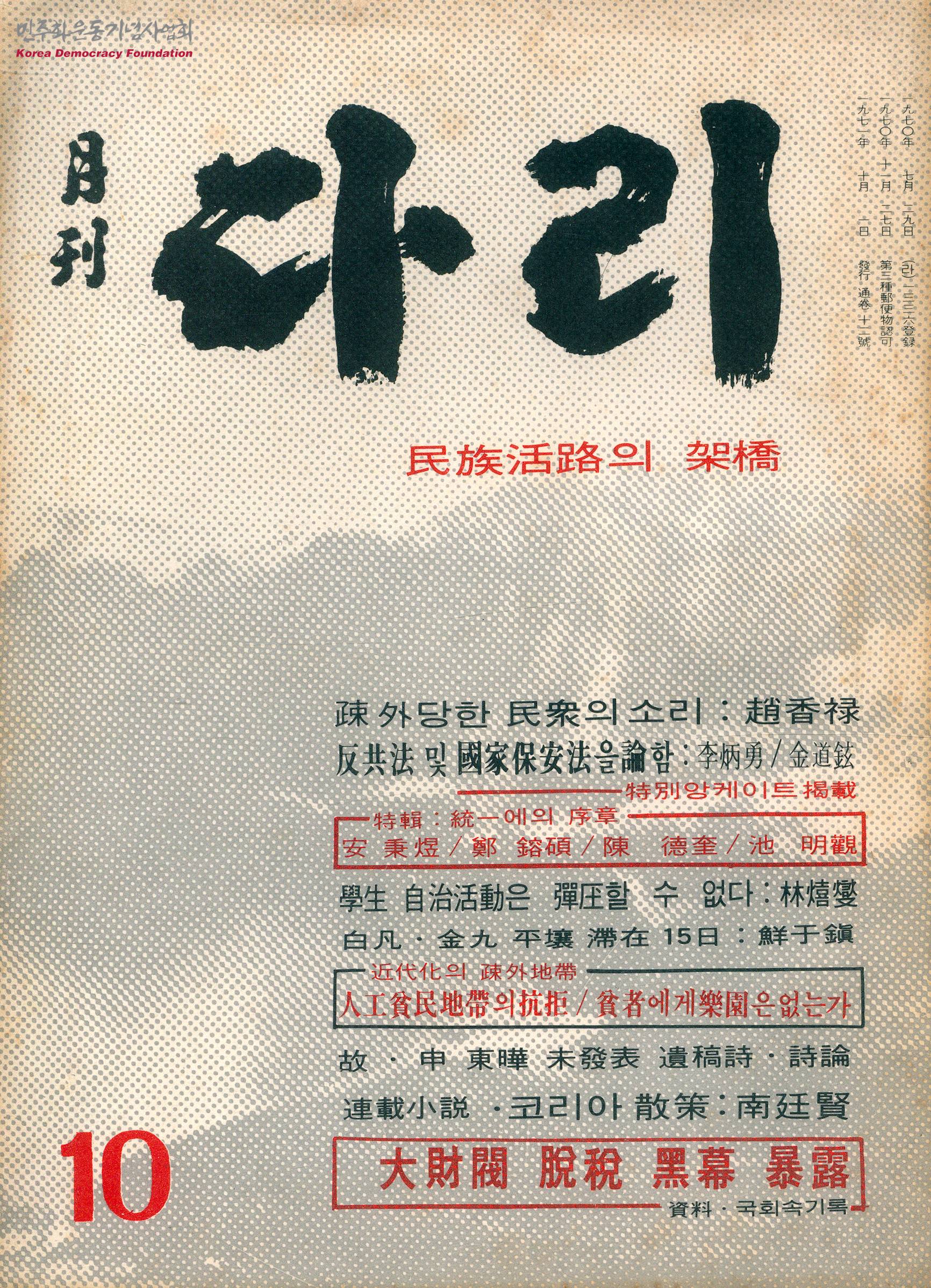 - 국민의 기본권을 지키고 정권의 정책과 현행법 사이의 괴리를 해결하기 위해 반공법과 국가보안법의 개정이 필요함을 주장하는 글과 경제성장의 이익이 가난한 이들에게는 돌아가지 않음을 짚으며 이들을 위한 제도가 필요함을 주장하는 글 등이 실린 정간물로 아래와 같은 목차로 구성되어 있음 - 소외당한 민중의 소리 - 반공법 및 국가보안법을 논함 - 특집: 통일에의 서장 - 학생 자치활동은 탄압할 수 없다 - 백범·김구 평양 체제 15일 - 근대화의 소외지대 - 고·신동엽 미발표 유고시·시론 - 연재소설 · 코리아산책 : 남정현 - 대재벌 탈세 흑막 폭로