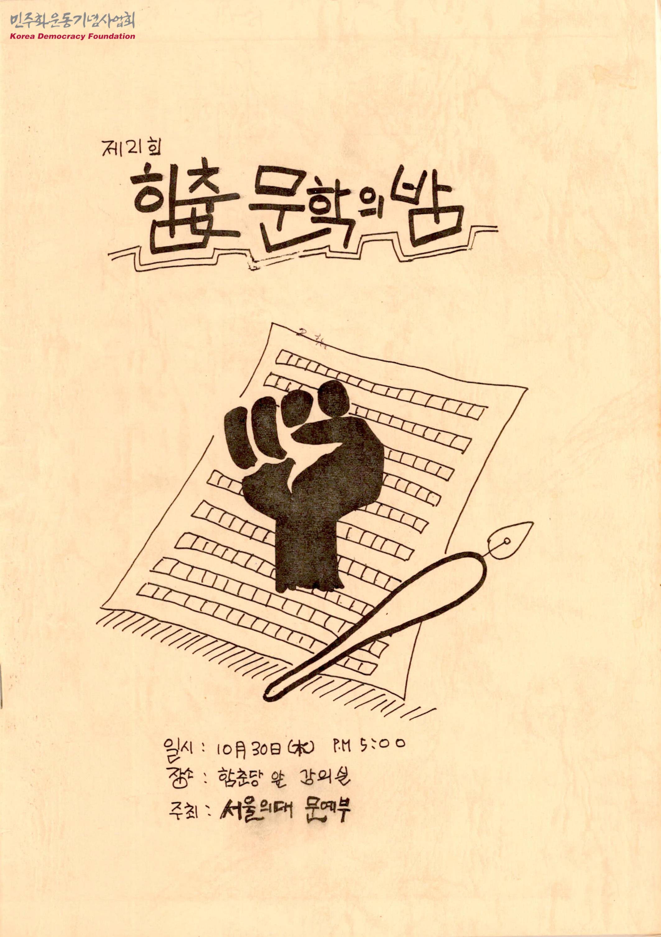 - 함춘당 앞 강의실에서 진행된 함춘 문학의 밤 행사에서 발표된 문학 작품들이 실린 자료집