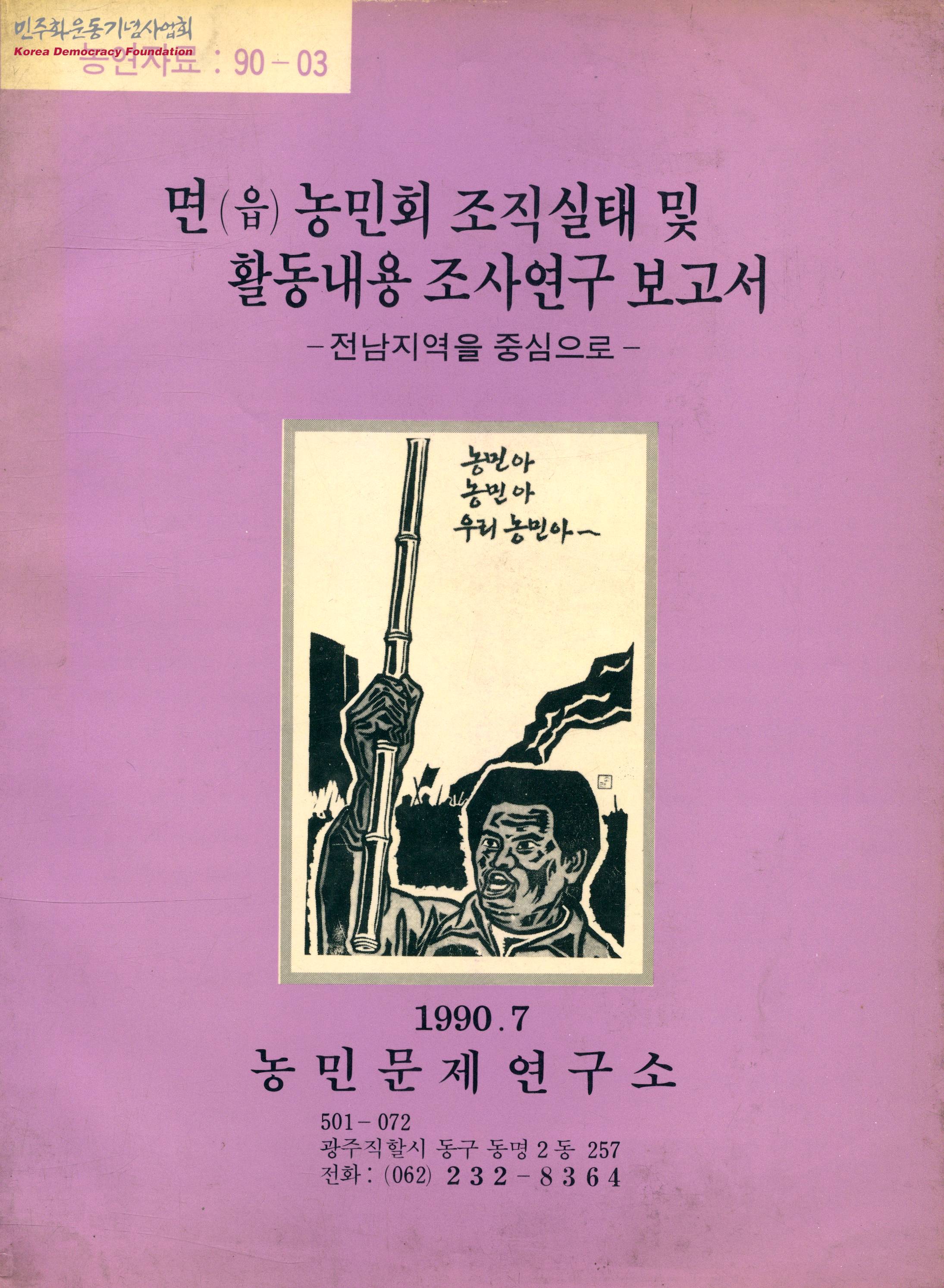 - 전체농민운동의 가장 큰 부분인 전남지역을 중심으로 면(읍) 농민회의 조직실태 및 활동내용을 조사연구하였으며, 이 분석결과를 자료로 발간한 문서로 목차는 다음과 같음 1. 머리말 2. 조사개요 3. 조사내용분석 4. 맺음말 5. 활발한 면농민회 조사 분석 내용/나주왕곡농민회 6. 부록