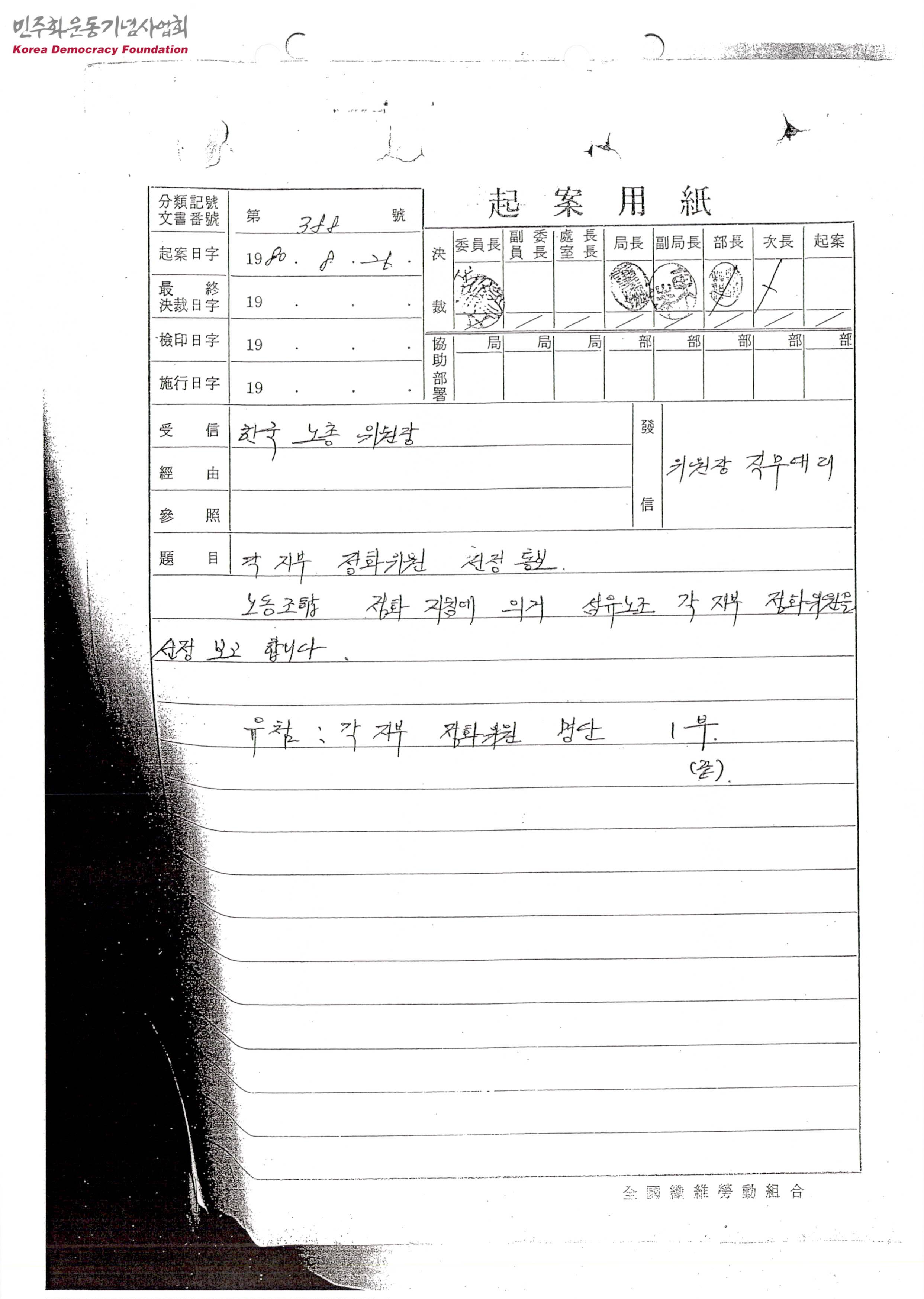 - 섬유노조 각 지부 정화위원을 선정했다는 내용이 수록된 문서로, 소속 집주, 성명, 직책 등의 내용이 수록된 정화위원 명단이 별첨되어 있음