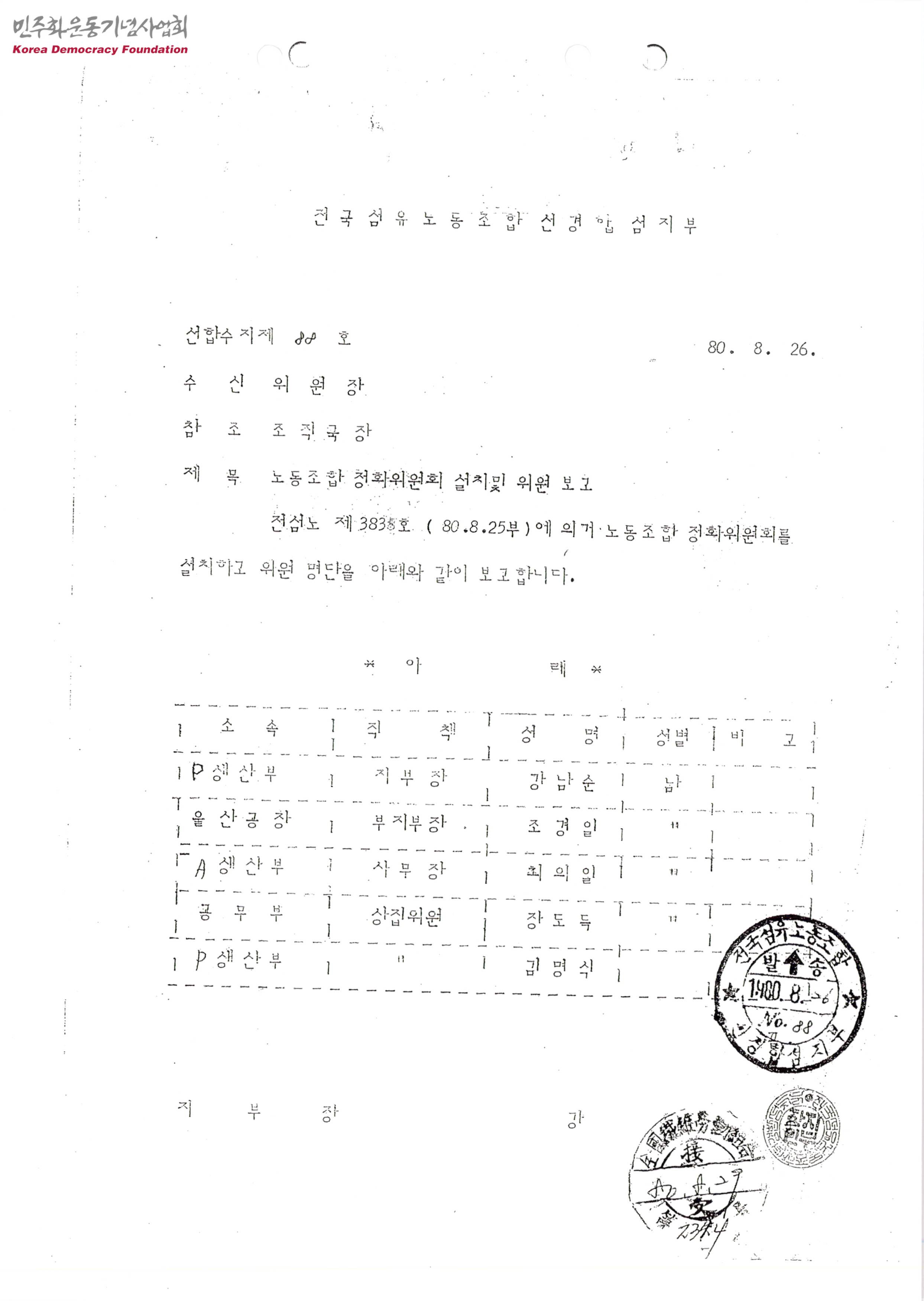 - 전국섬유노동조합 선경합섬지부 정화위원회 위원의 소속, 직책, 성명 등의 내용이 수록된 문서