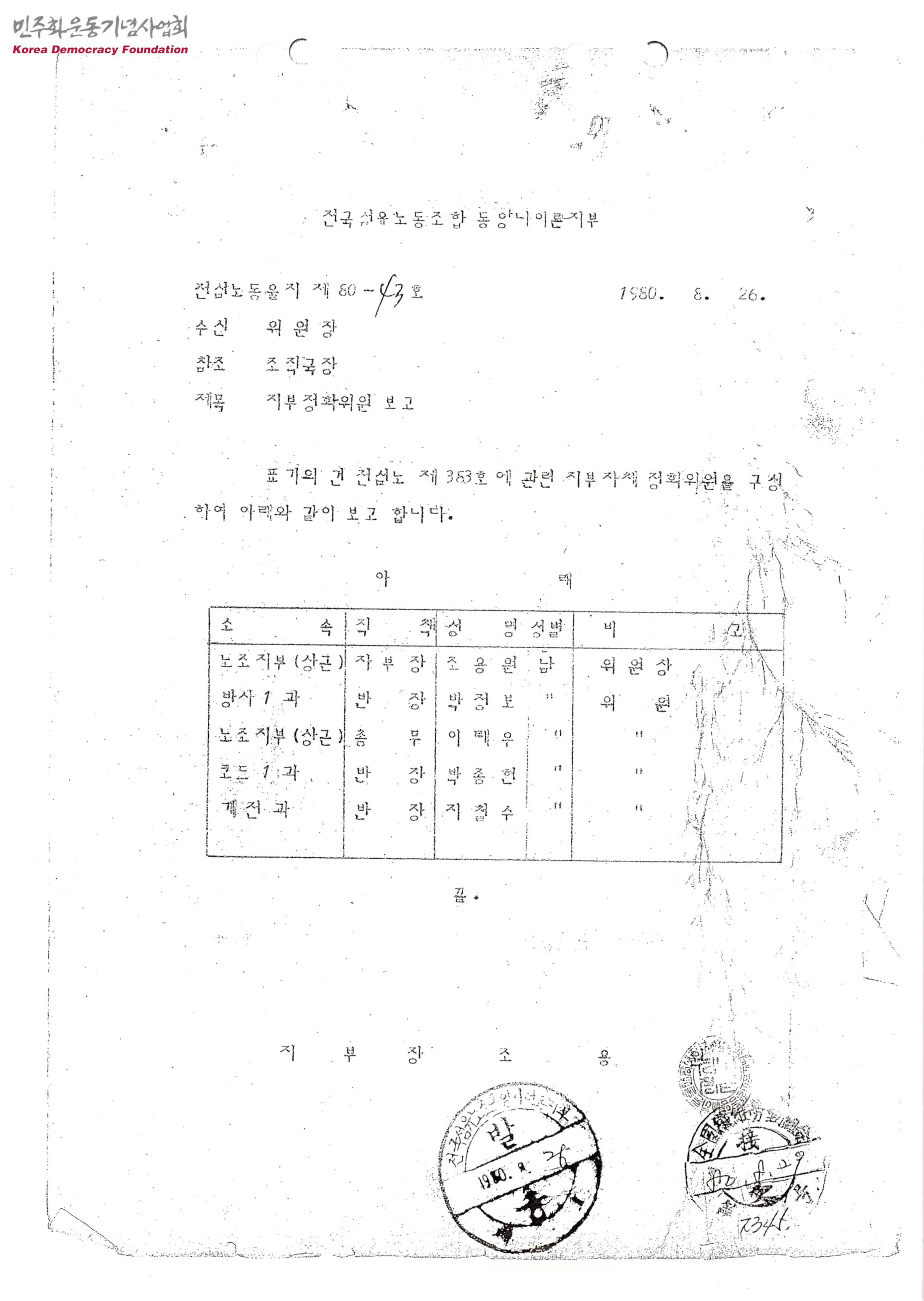 - 전국섬유노동조합 동양나이론지부 자체 정화위원의 소속, 직책, 성명 및 성별, 특이사항 등의 내용이 수록된 문서