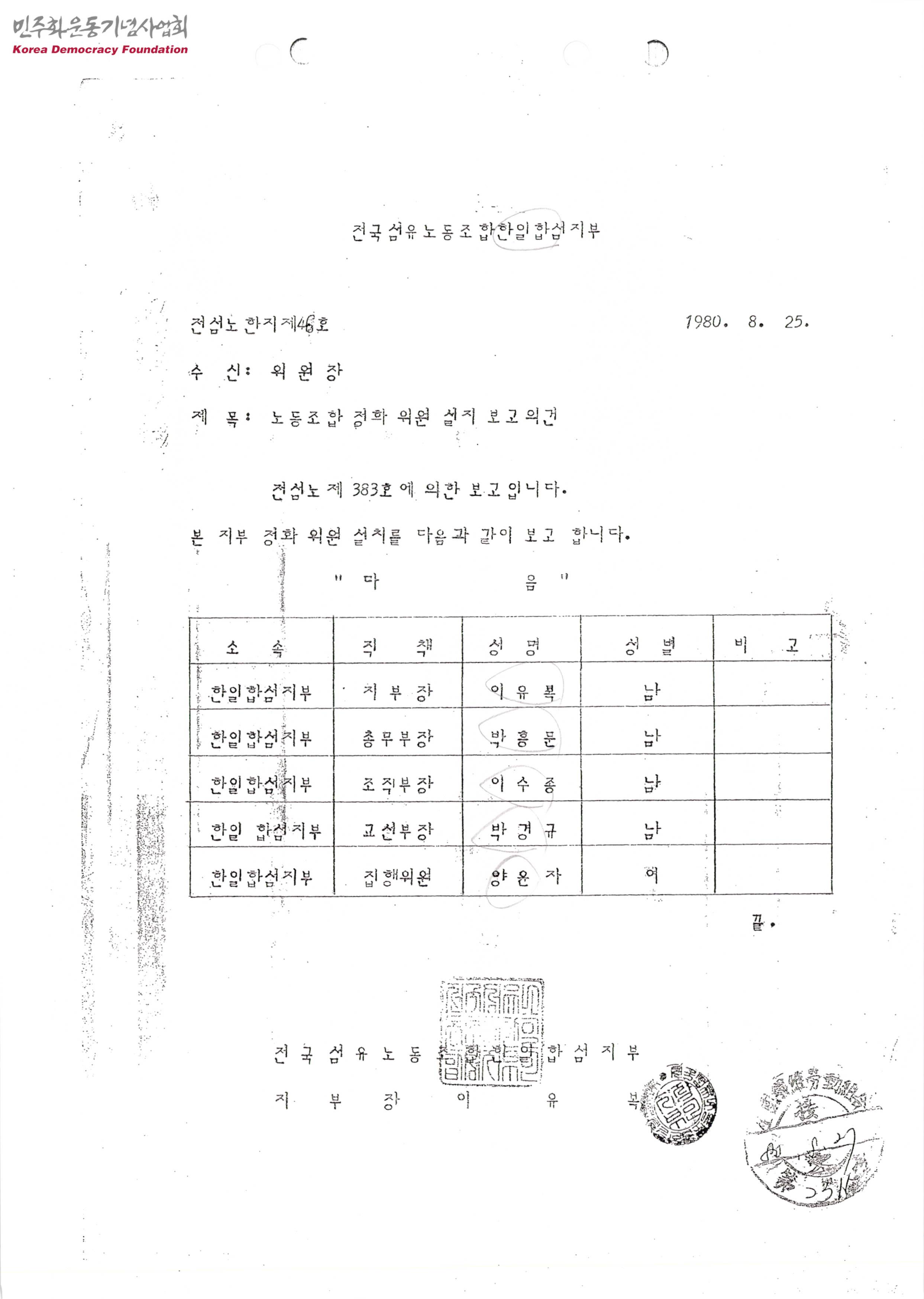 - 전국섬유노동조합 한일합섬지부 정화위원에 이유복 외 4명이 임명되었다는 내용이 수록된 문서