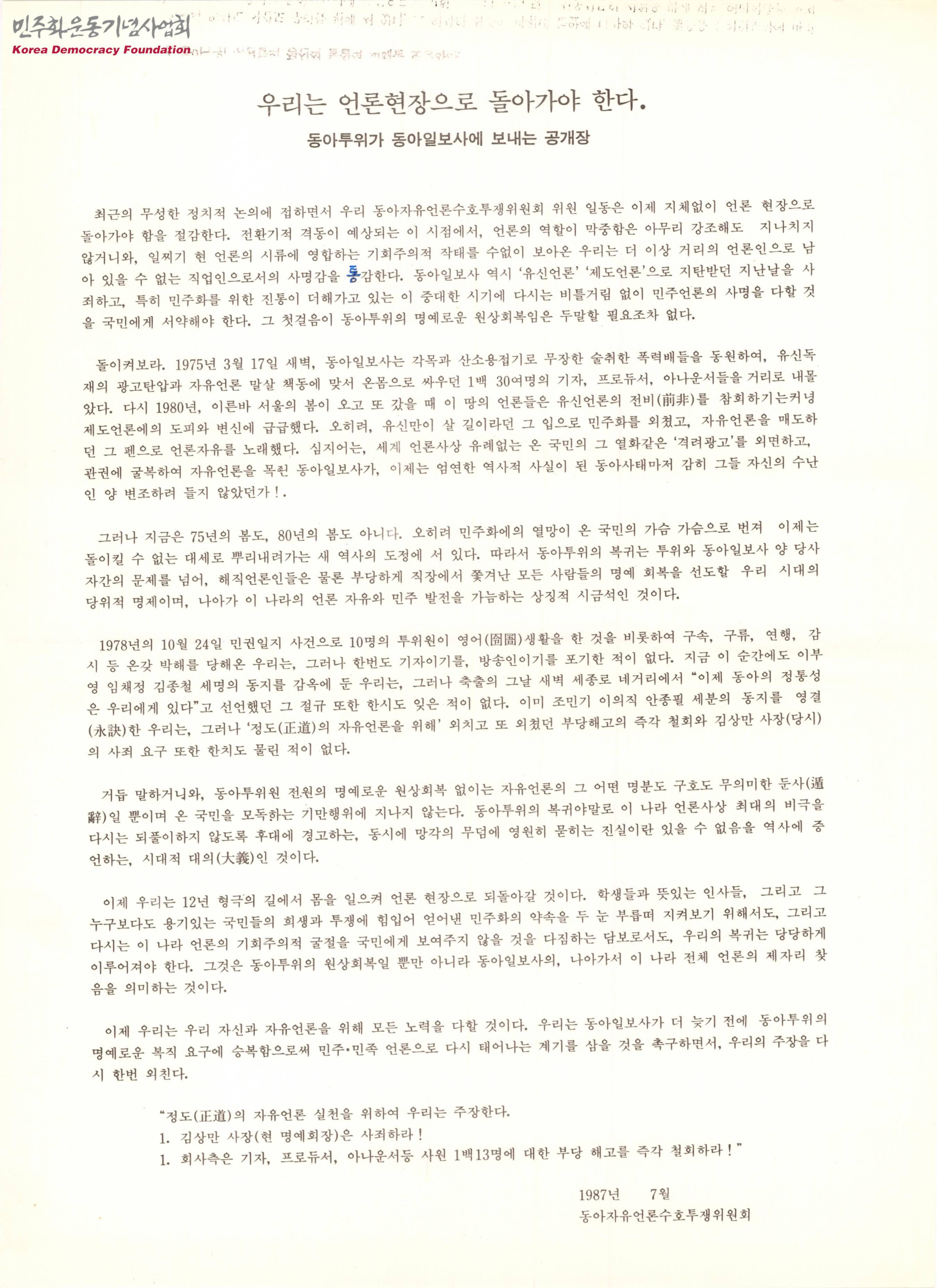 - 1975년과 1980년의 언론 탄압, 동아투위 전원의 명예로운 일상 회복 요구 등의 내용이 수록된 공개장으로 이들의 주장은 다음과 같음 1. 김상만 사장(현 명예사장)은 사퇴하라 1. 회사측은 기자, 프로듀서, 아나운서 등 사원 1백13명에 대한 부당 해고를 즉각 철회하라