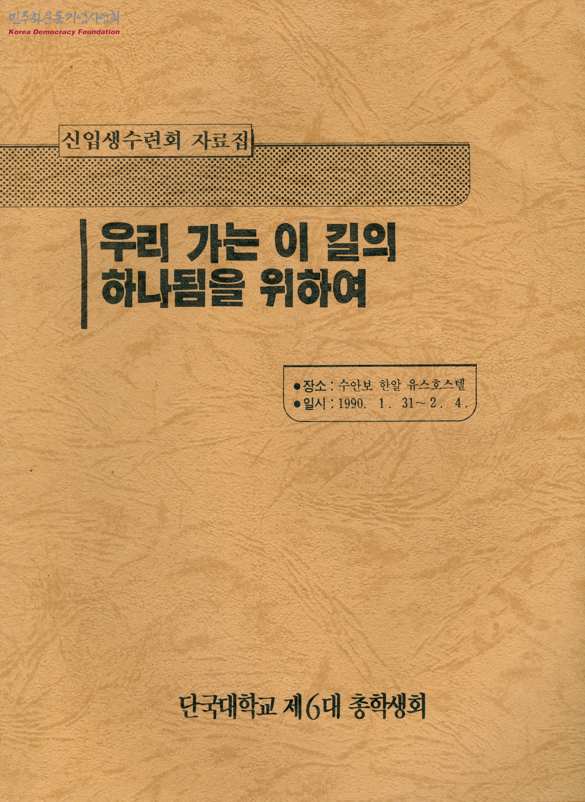 - 단국대학교 90년 신입생수련회 자료집으로 목차는 다음과 같음 1. 총학생회장 인사말 2. 후배에게 3. 총학생회 조직표 4. 민중해방열사 고 최덕수동지 소개 5. 각단과대 인사말 <기획> 1. 노동자란 누구인가 2. 전노협 만세 <특집> 1. 전교조 2. 시 - 책소개 - 노래